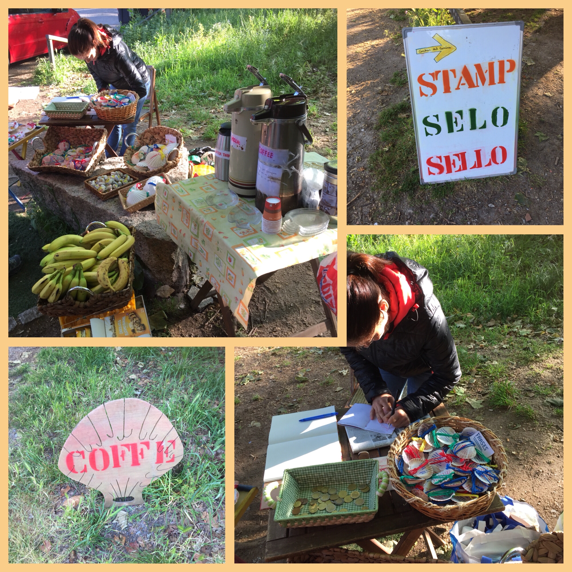 Vanmorgen liep ik rond 7.15 uur weer fris en fruitig de deur uit. Op zoek maar een bakker en koffie.. ik zag zo snel niks dius besloot te gaan lopen want meestal is er vrij snel wel ergens iets om de dag op te starten. Vandaag dus niet. Dat werd een ontbijt van een appel met water. De wandeling van vandaag zou 21 km zijn met daarbij wat klimmen dus zo rond de 23 km. Ik liep alleen. Het zonnetje kwam nog niet door maar doordat er gelijk een flinke berg op me lag te wachten stond het zweet op mijn rug toen ik boven kwam. Terwijl ik even lekker wilde gaan staan om bij te komen zie ik daar ineens Magda, de Poolse die ik in de eerste dagen ontmoet had. Zij was achter gebleven omdat het te zwaar was maar had gisteren 40 km gelopen om het weer in te halen. Grappig wat je voelt op zo’n moment, alsof je een vriendin onverwacht tegenkomt als je op vakantie bent. We hebben gezellig even samen gelopen en zeiden tegen elkaar dat we zo’n trek hadden in koffie…ineens kijken we elkaar blij verrast aan want onderaan de berg staat een meisje met een zelfgemaakt stalletje en verkoopt… koffie!! Mooie 5 minuten stop en weer verder.. het is wat lastig communiceren met elkaar want ze spreekt 3 woorden Engels en ik 3 woorden Frans en na 3x ca va weet ik inmiddels wel hoe het met haar gaat. Ze loopt ook wat langzamer dus bij haar volgende stop ben ik door gelopen, zonder wat te zeggen:) nee hoor! We zouden elkaar op het eindpunt wel weer zien in de Alberque.