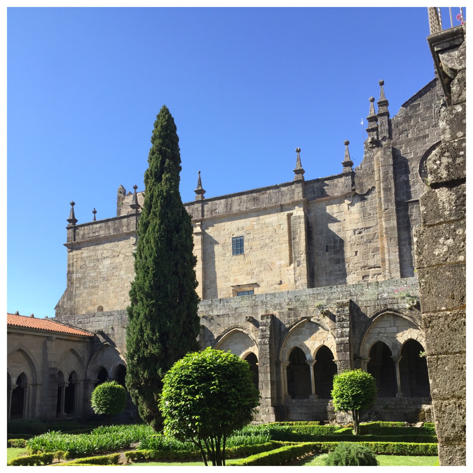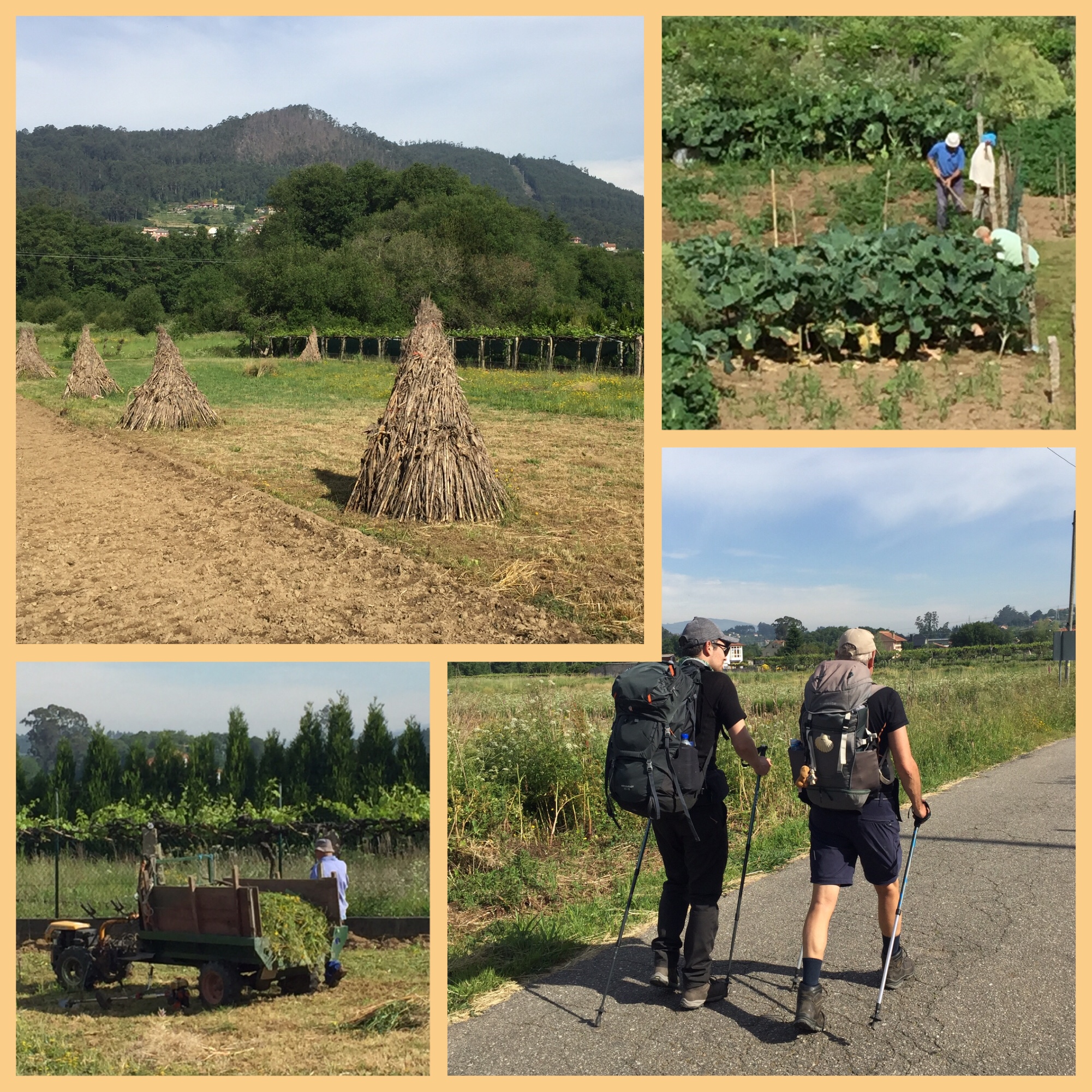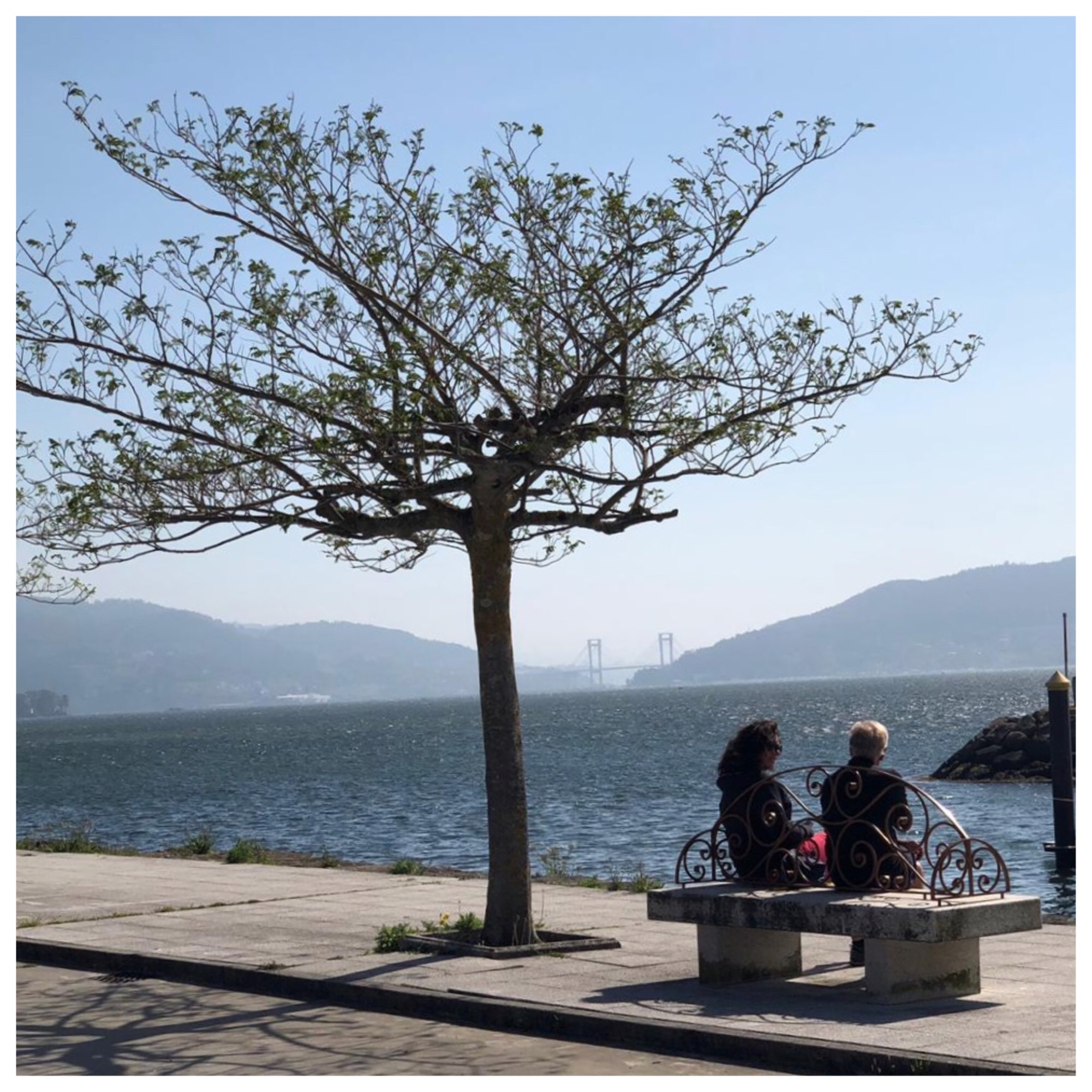 De haan kraaide toen ik rond half 8 de deur uitliep. Mijn gezicht leek erger opgezet en ook mijn hand is zwaar gekneusd en erg dik maar verder voelde ik me fit genoeg om weer op pad te gaan. Geen spierpijn of andere ellende. Wel merkte ik al snel dat ik wat bibberig was en steeds naar de grond liep te kijken. Op een mooi recht stukje eerst even mn kind gebeld die net als ik op avontuur ging met school. Daarna weer door…ik was niet vooruit te branden. Vond er ook niks aan en had heel erg het gevoel dat ik bij de volgende koffiestop ook gewoon helemaal zou stoppen. Om de 5 minuten stond ik stil, fotootje maken dan maar en weer 10 stappen verder. Eindelijk boven op een berg zag ik een terrasje. Het was er gezellig druk en omdat ik inmiddels een bekend hoofd heb werd ik vrolijk begroet en mijn naam al van ver geroepen. Er bleken ook nog 2 ‘nieuwe’ Nederlanders bij te zitten. We raakte aan de praat over wat er gebeurd was en zaten al snel gezellig te kletsen. Langzaam aan stapte de een na de ander weer op… Kristien een vrouw uit New Castle, Carlos uit Italië met het uiterlijk van een Schot, beetje Popeye type, Susan ook uit Engeland die steeds als ze me ziet haar voorraad pilletjes tevoorschijn tovert, Cees en Johanna 2 lieverds uit Zeeland, een charmante Duitser met wie ik al heel wat uren doorgebracht heb maar vandaag ineens besefte dat ik zijn naam eigenlijk niet eens weet, het mooiste meisje van de Camino een 26 jarige Duitse…Doutzen Croes eat your heart out… de twee heren stonden op toen ik ook weer op het punt van vertrekken stond. Ik voelde dat ik een boost had gekregen van dit weerzien en de gezelligheid. We zette het gesprek al wandelend voort. Joshua een 30 jarige Brabander en Pico een 71 jarige Rotterdamse Hagenees😃 Ik was door mijn dip heen. Voelde mijn rugzak niet meer en liep weer vol energie die dag verder. Rond de middag liepen we via de brug vanuit Portugal, Spanje in. Toch wel een bijzonder moment. De mannen hadden een reservering maar besloten eerst nog even wat te eten bij een super leuk hostel. Ik zou proberen hier te slapen. Helaas het was al vol dus ik besloot met hun mee te gaan. Er was nog een bed vrij. Na een lekkere douche gingen we de stad in om de Kathadraal te gaan bekijken. Heel erg mooi! Daarna tijd om ergens neer te strijken. We kwamen Kristien en Carlos tegen. Dat werd een hele gezellig avond. Af en toe schoof er nog iemand aan. Wat tapas gegeten en vooral veel gelachen. Inmiddels was het donker en werd het terugvinden van het hostel een uitdaging….