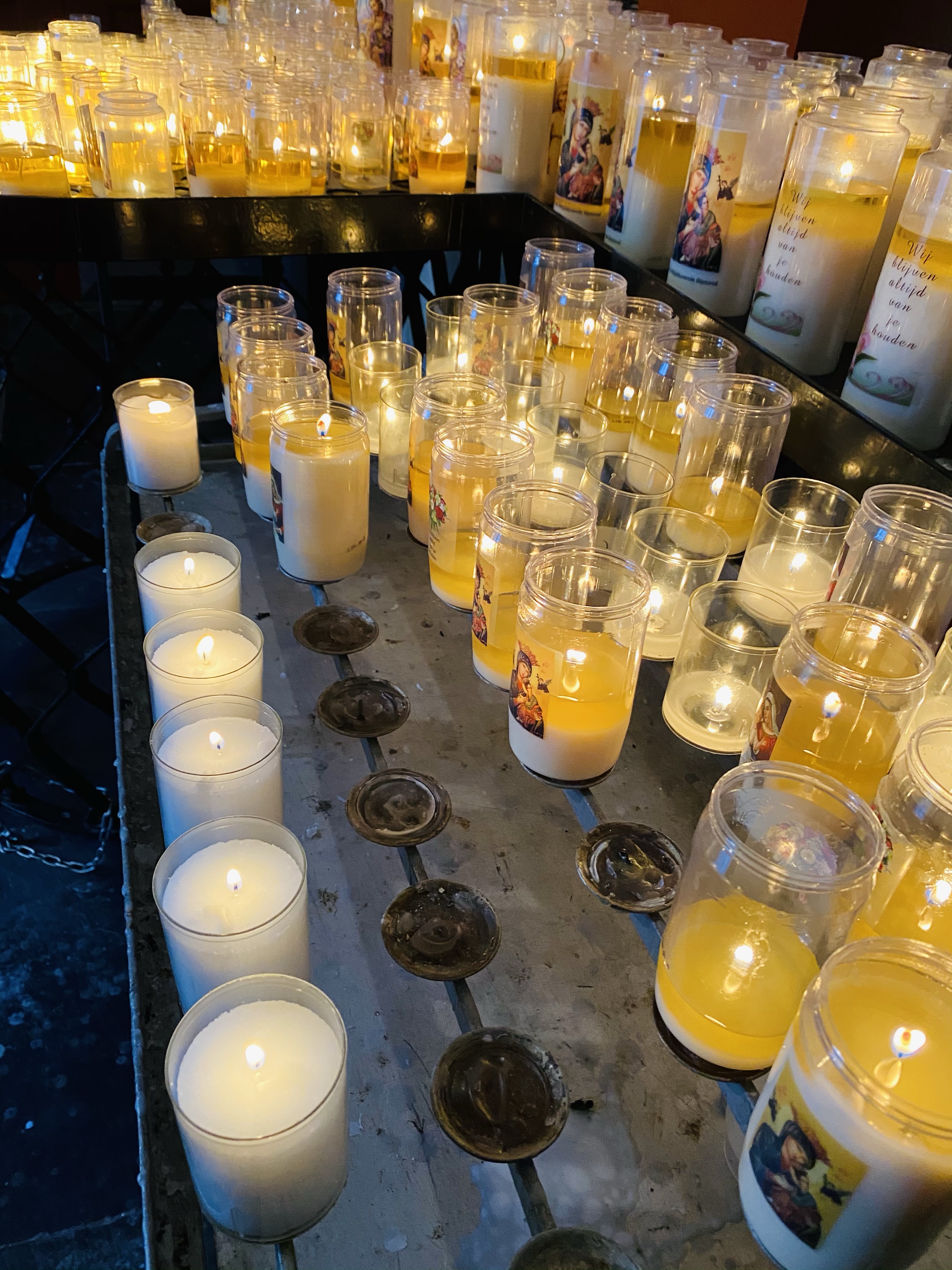 Met tranen in mijn ogen kocht ik 5 kleine kaarsjes en stak ze aan. In gedachten ging ik naar al de pelgrimvrienden die voor altijd in mijn hart zitten, naar mijn kind en de dankbaarheid die ik voel dat ik moeder mag zijn, naar de mensen die ziek zijn, het moeilijk hebben of overleden zijn, naar mijn eigen verdriet en dromen en naar iedereen op deze wereld waar zoveel liefde en licht nodig is. Zo kreeg ieder kaarsje zijn eigen betekenis, net als altijd…