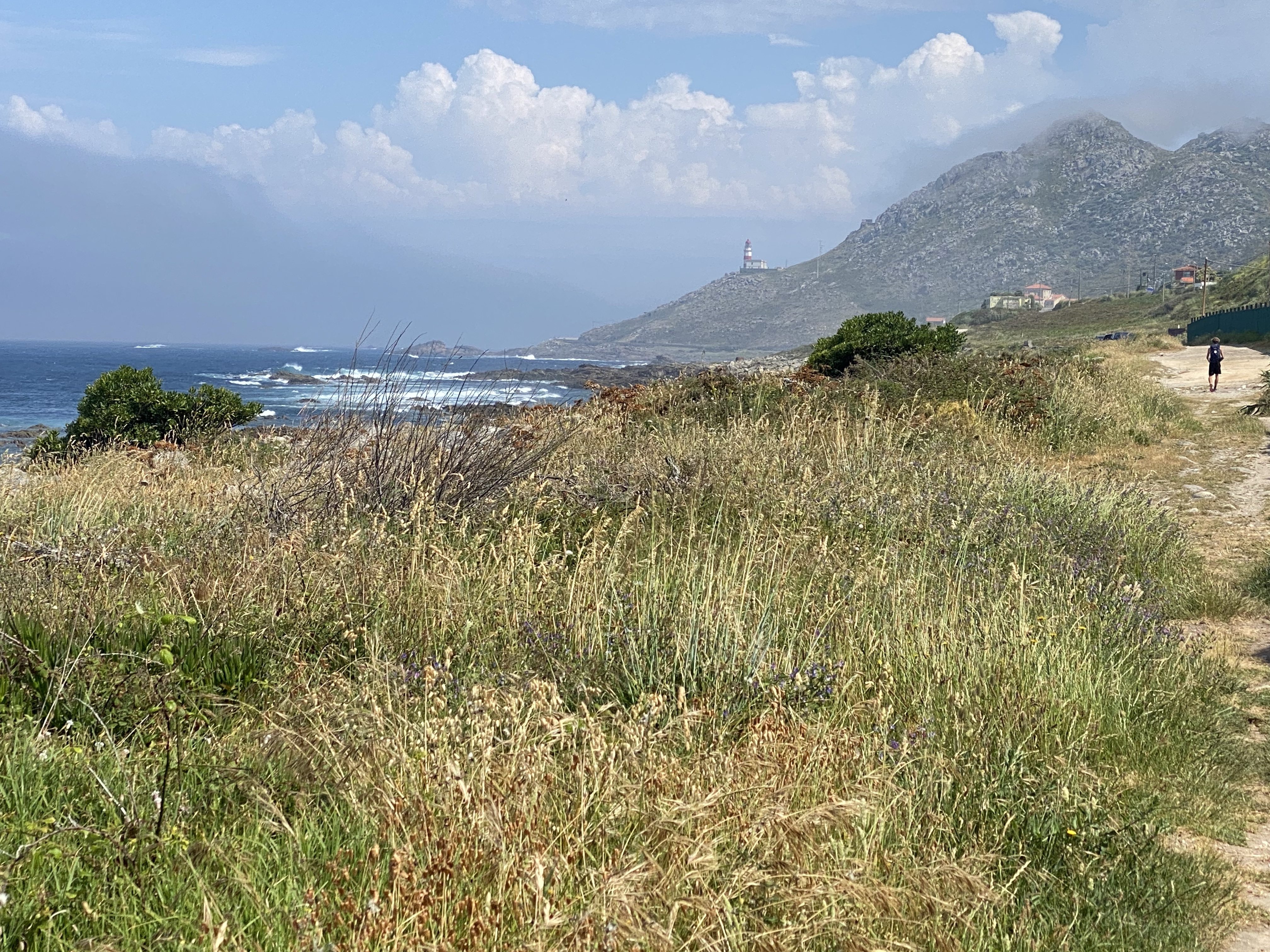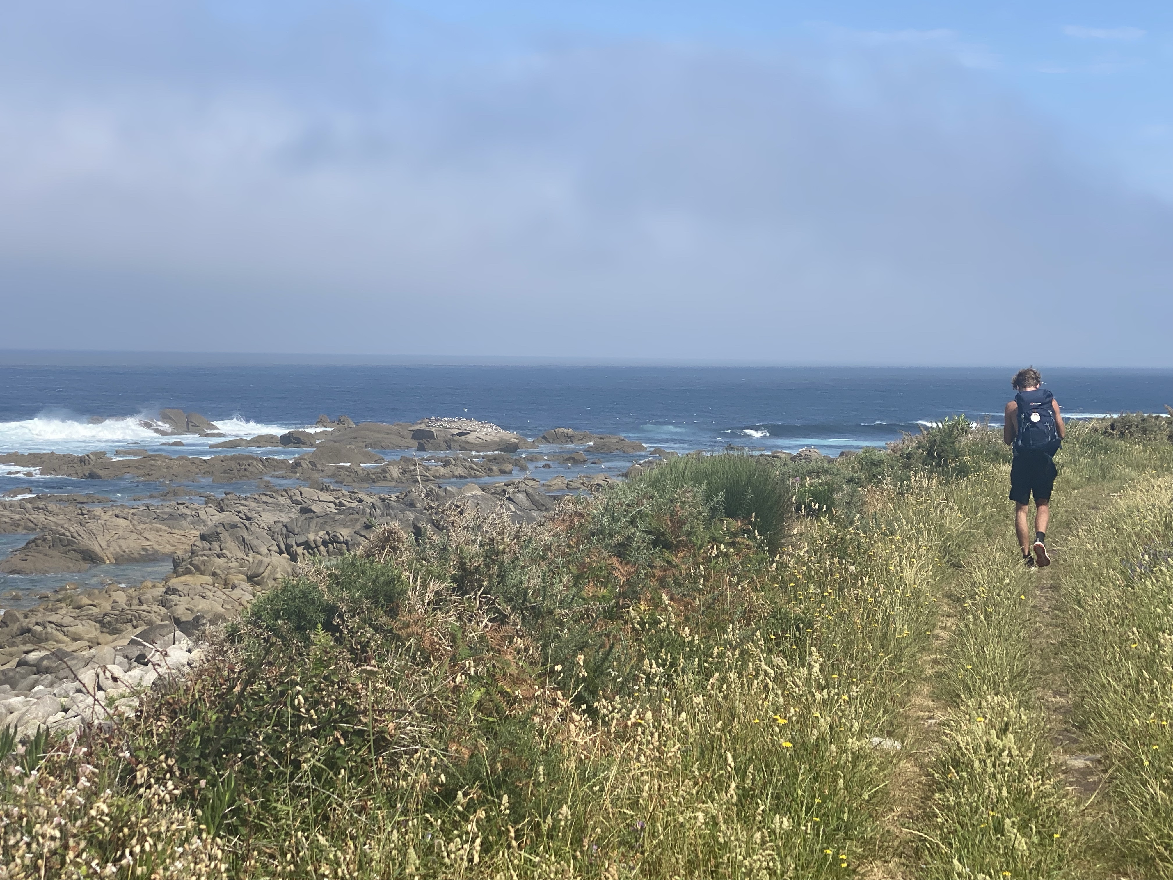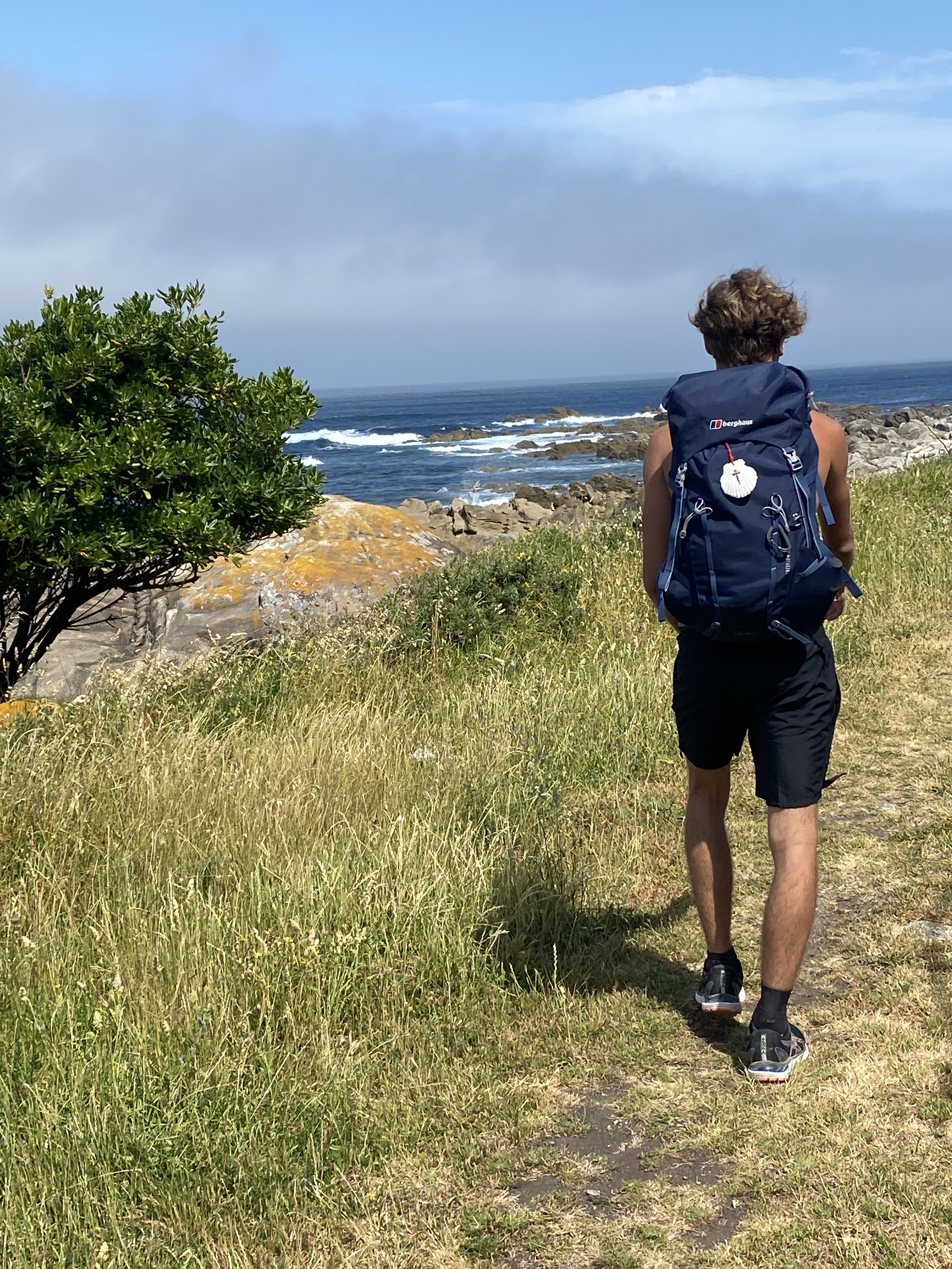 Het weer was minder warm maar nog steeds wel zonnig. Ik vond het heerlijk. Beetje wind, wat letterlijk en figuurlijk een duwtje in de rug gaf. De route was afwisselend langs de kust en door de bossen. Wat flinke klimmetjes waar Pepijn altijd even een voorsprong maakt. Heeft hij tijd om zich op zijn nieuwe Caminofavorietje te storten… hou je vast, dop pinda’s. We kregen ze begin van de reis bij de koffie, tis weer eens wat anders, en sindsdien is het bovenste vak van zijn rugzak er altijd mee gevuld.