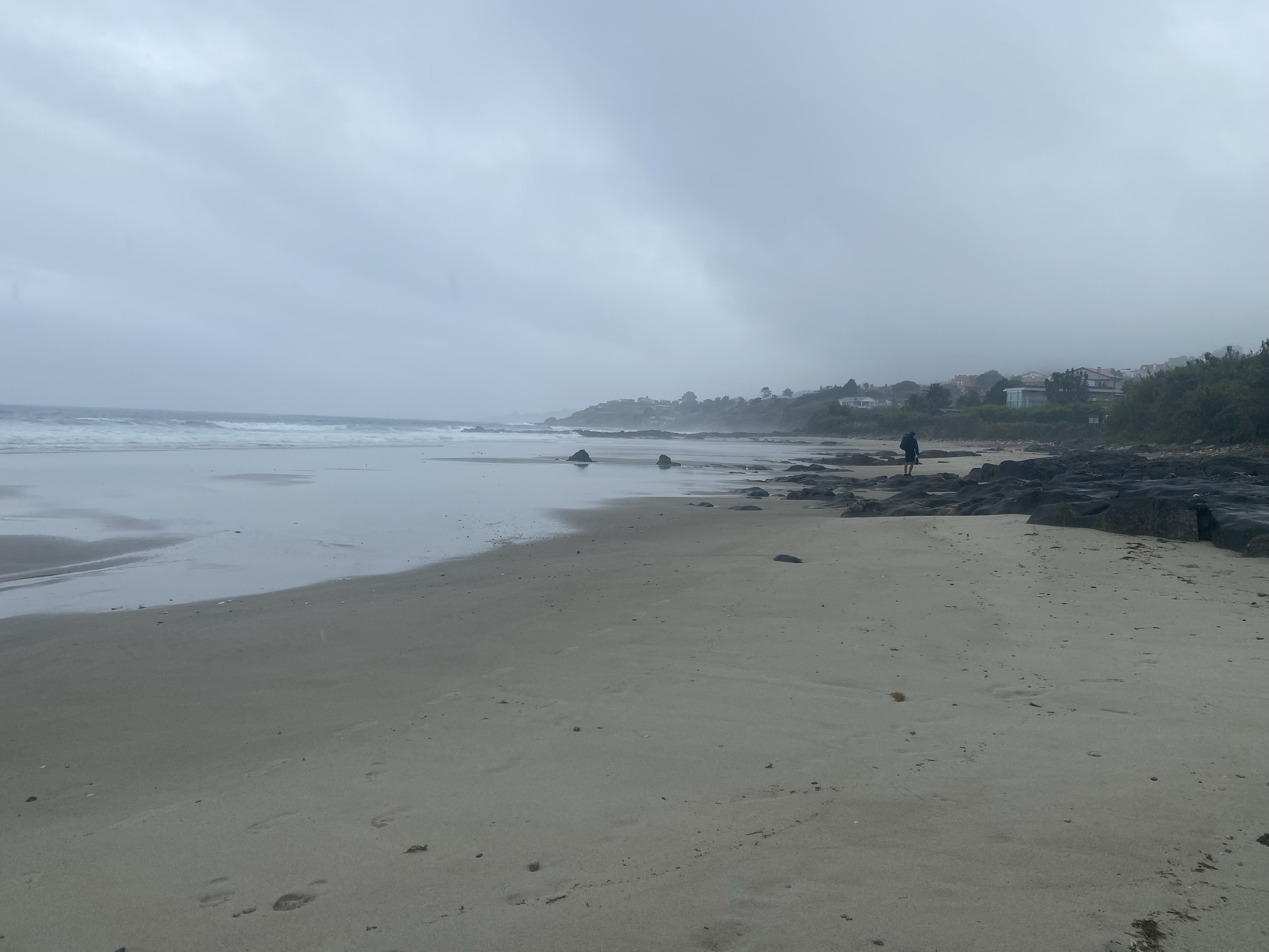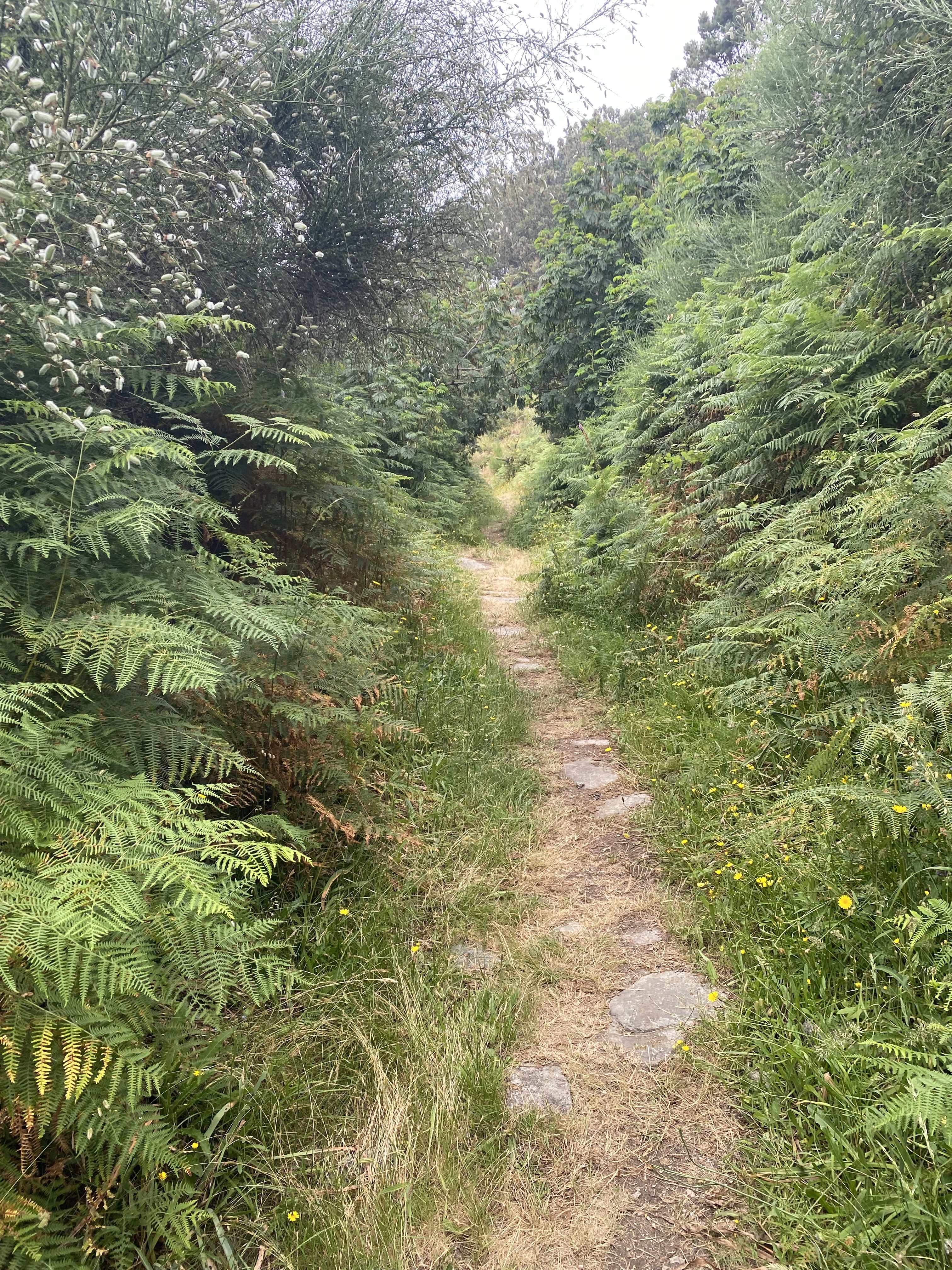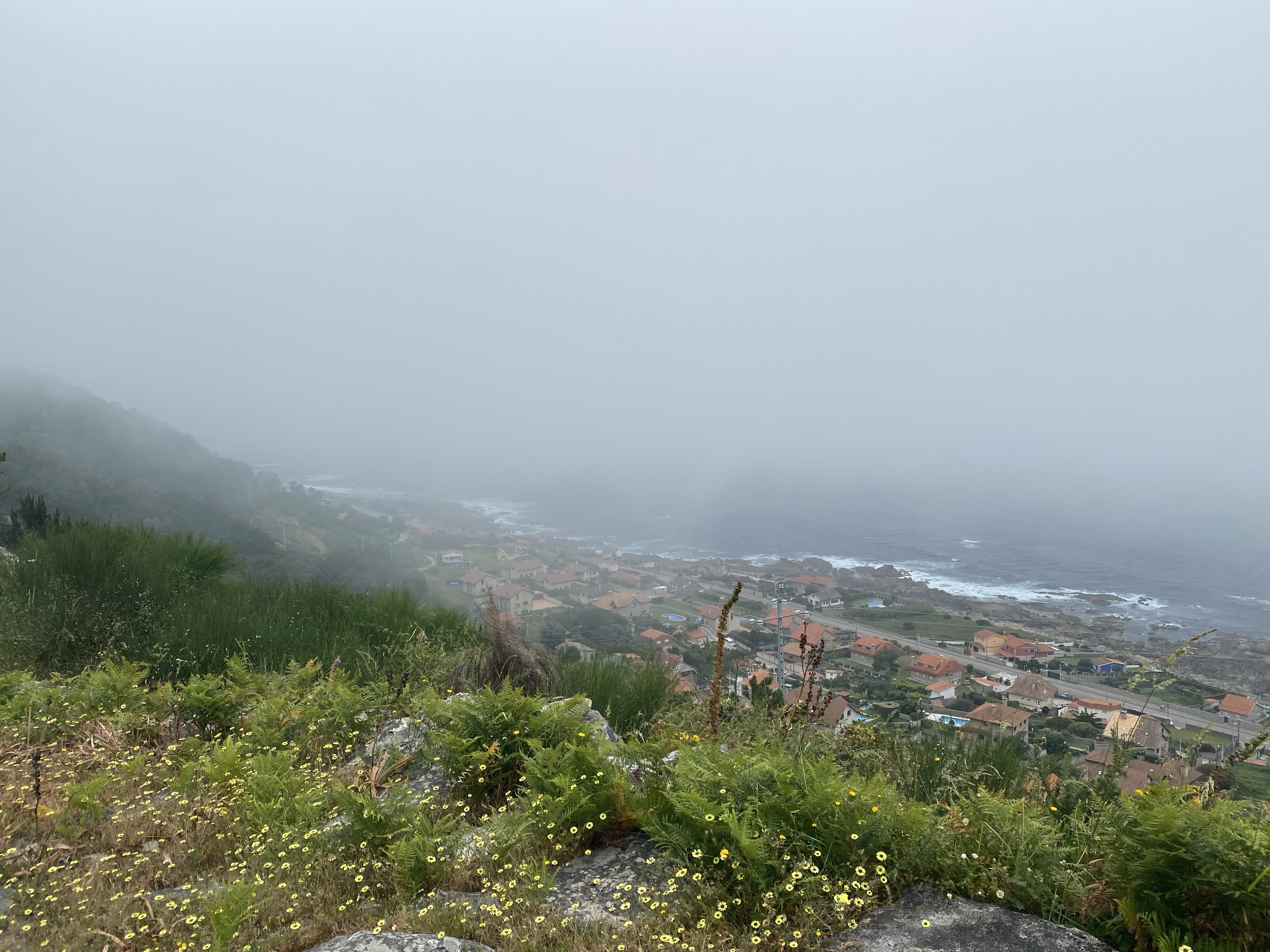 Toen we weer door liepen werd het langzaam aan droog. Wat een feest. Zo’n anderhalf uur wapperde onze regenkleding als een cape achter ons aan. We liepen zelfs weer samen Hazes te zingen. Deze dag zouden we het kustpad nemen. Er is namelijk nog een andere maar daarin zitten meer klimmetjes en door de bossen. Nog smeriger met al die plassen en modder. Tot halverwege ging het goed, daarna hebben we waarschijnlijk onbewust de verkeerde keuze gemaakt en zagen we boven aan de berg de zee ineens wel erg ver bij ons vandaan. Dan maar zo want terug naar zee betekende een half uur langer en het goot inmiddels weer… echt gieten met hoofdletters. Steeds harder en harder…