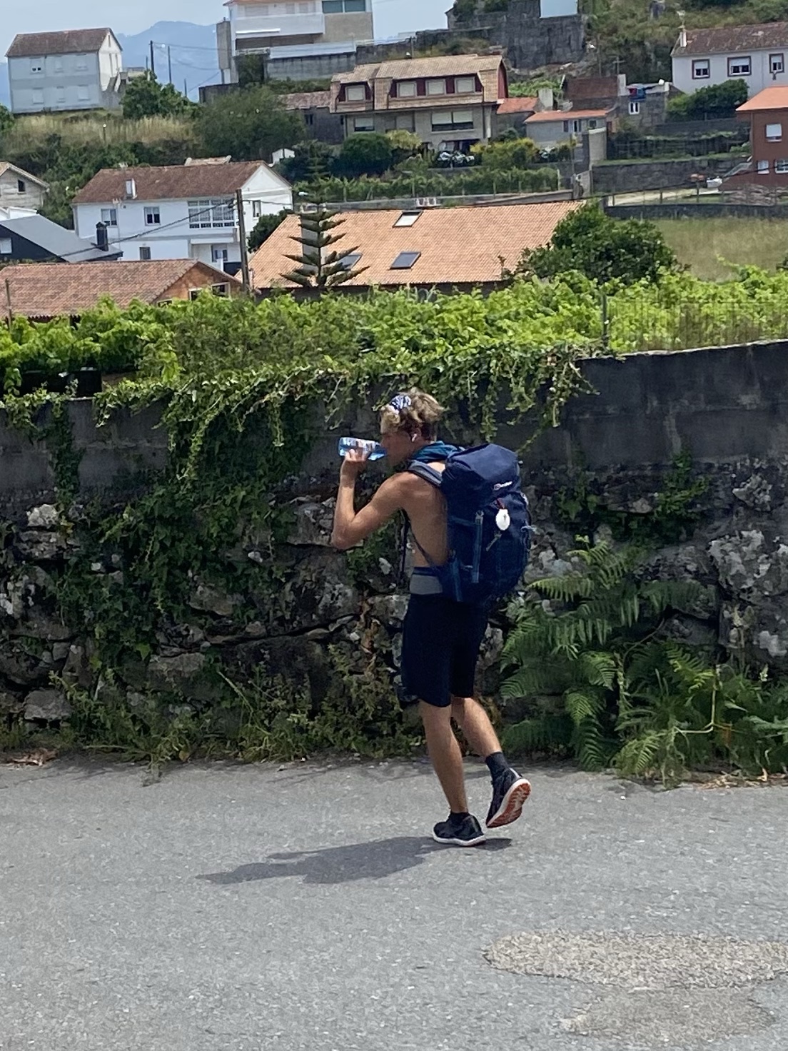 We kwamen al rond 15.00 uur op de volgende plek aan. Pepijn begint wat moe te worden. Ook omdat hij het ‘s avonds heel gezellig heeft met zijn vrienden op de app. Hij bleef daarom lekker in de tuin hangen terwijl ik wat boodschappen deed. Het camino gevoel wat betreft contact met andere pelgrims is er niet, simpelweg omdat we er misschien 4 gezien hebben, 1x. Best jammer want dat krijgt Pepijn nu niet mee maar daarvoor in de plaats beweeg ik een beetje met hem mee. Hij is helemaal op de gezonde toer dus met de halve groente en fruit afdeling in mijn tas liep ik weer terug. ‘s Avonds een rondje door de stad waar Pepijn nog even een workout ging doen. Ik zie echt steeds meer hoe hij op mij lijkt😇 Einde van de dag hadden we 22 kilometer op de Fitbit. Vergeleken met de vorige dag een lekker kort dagje.