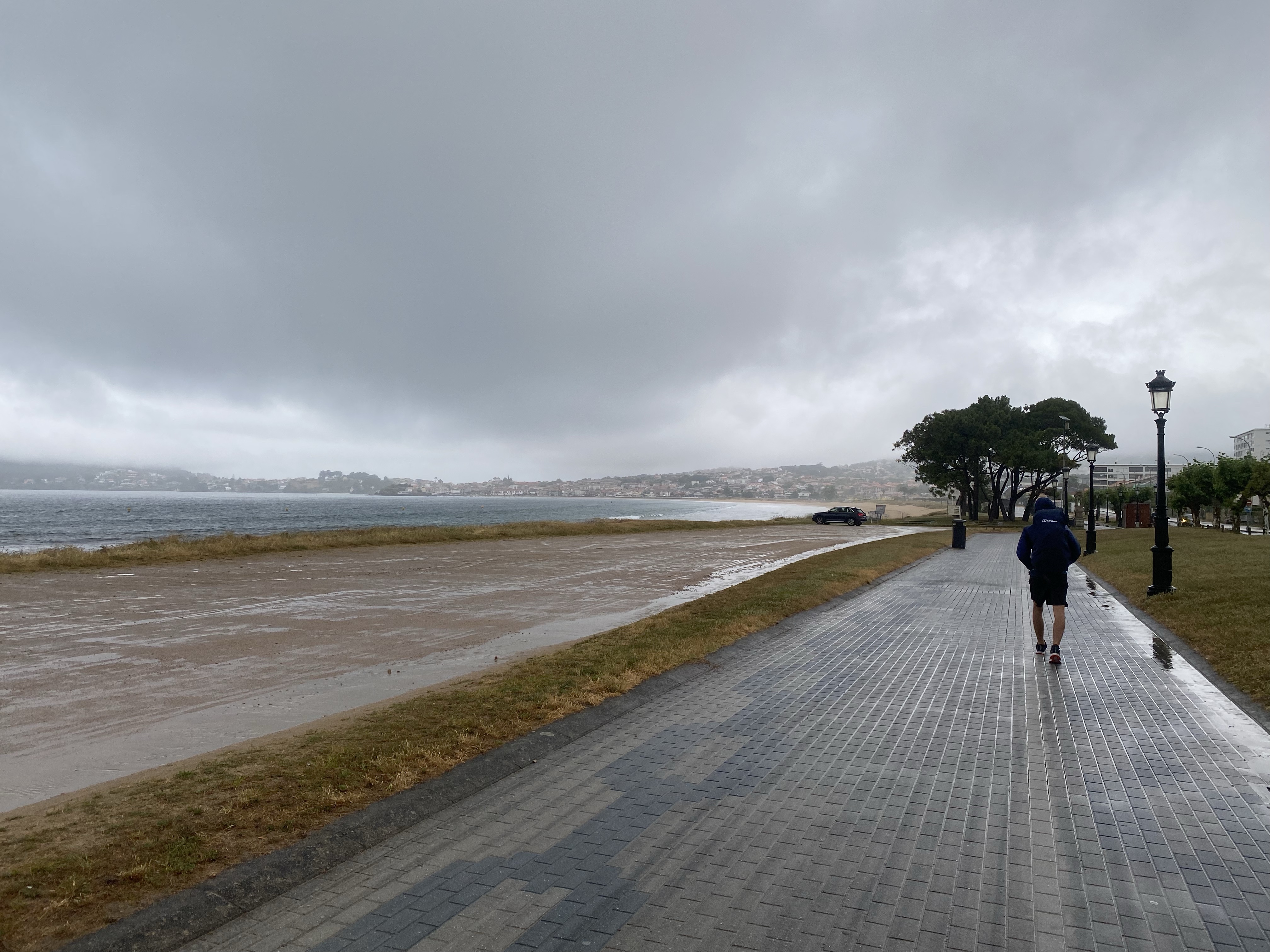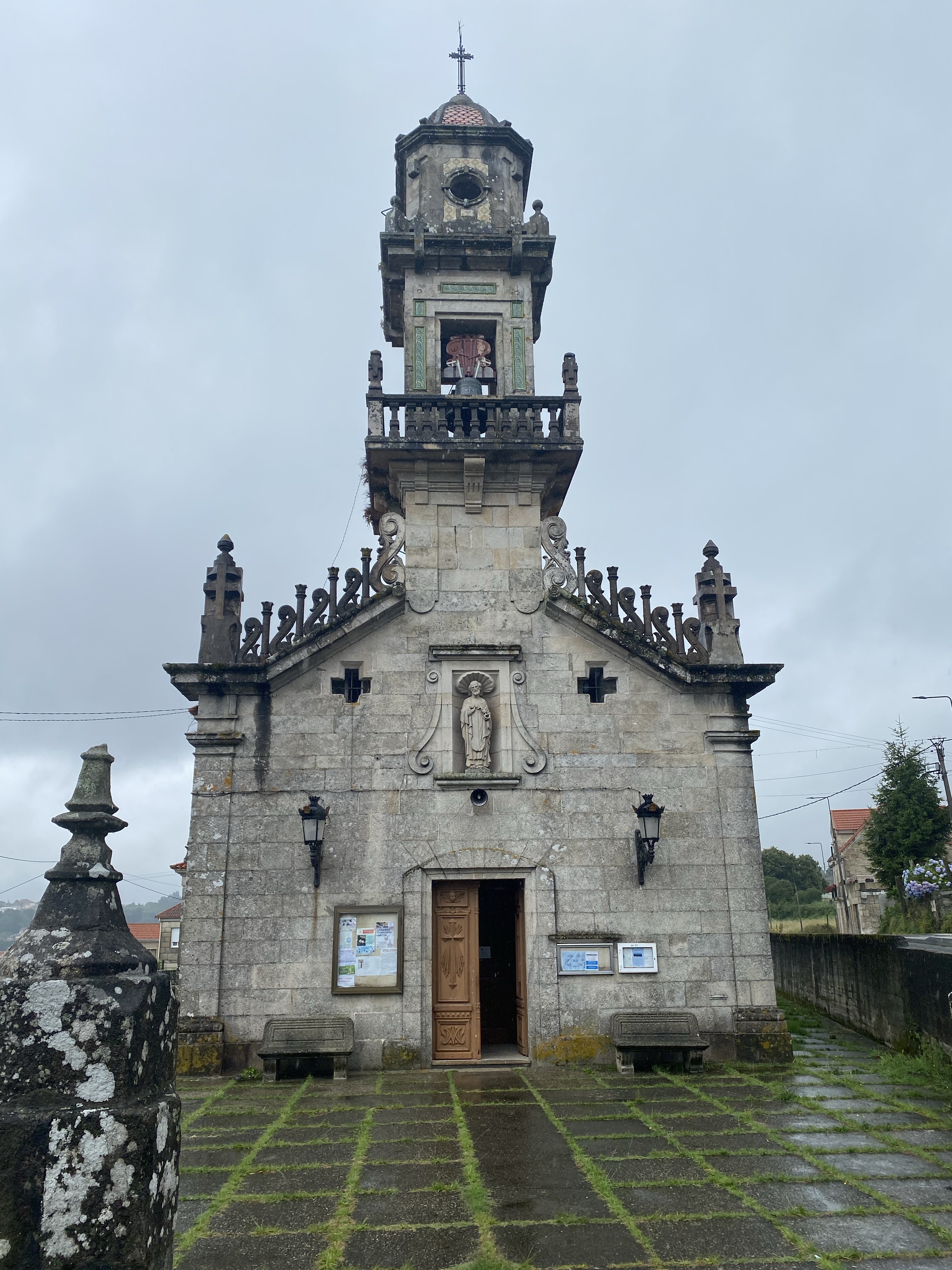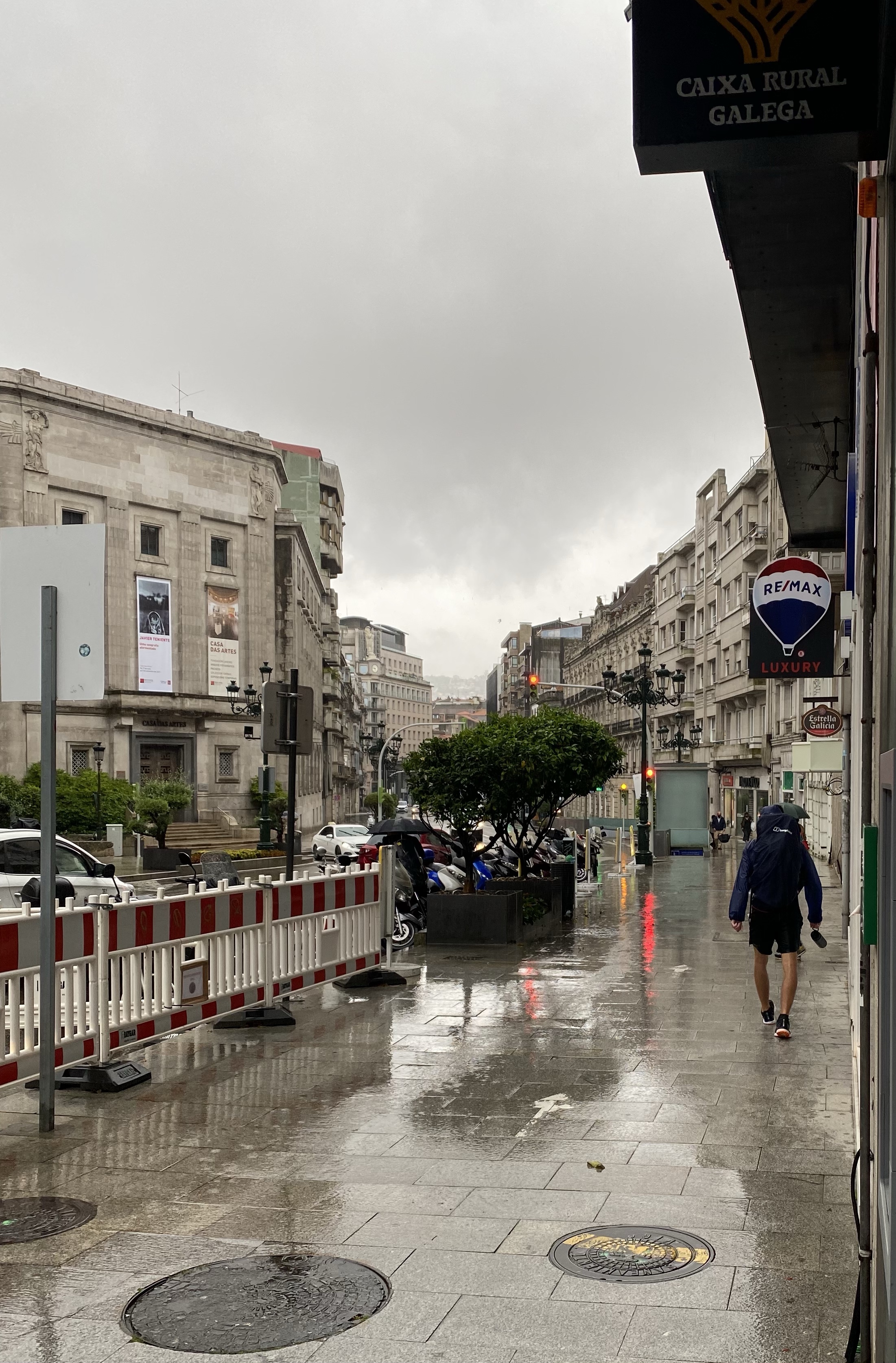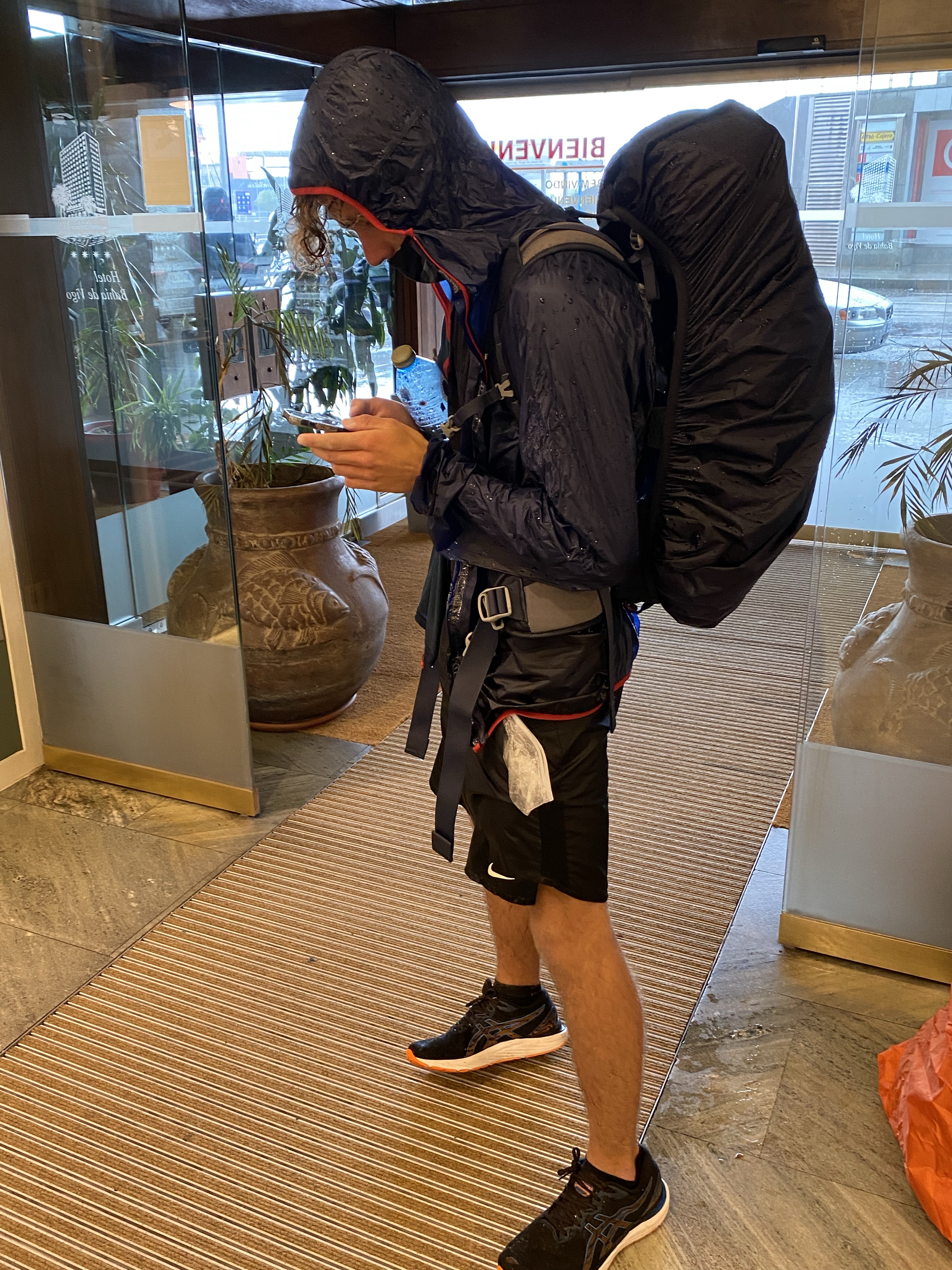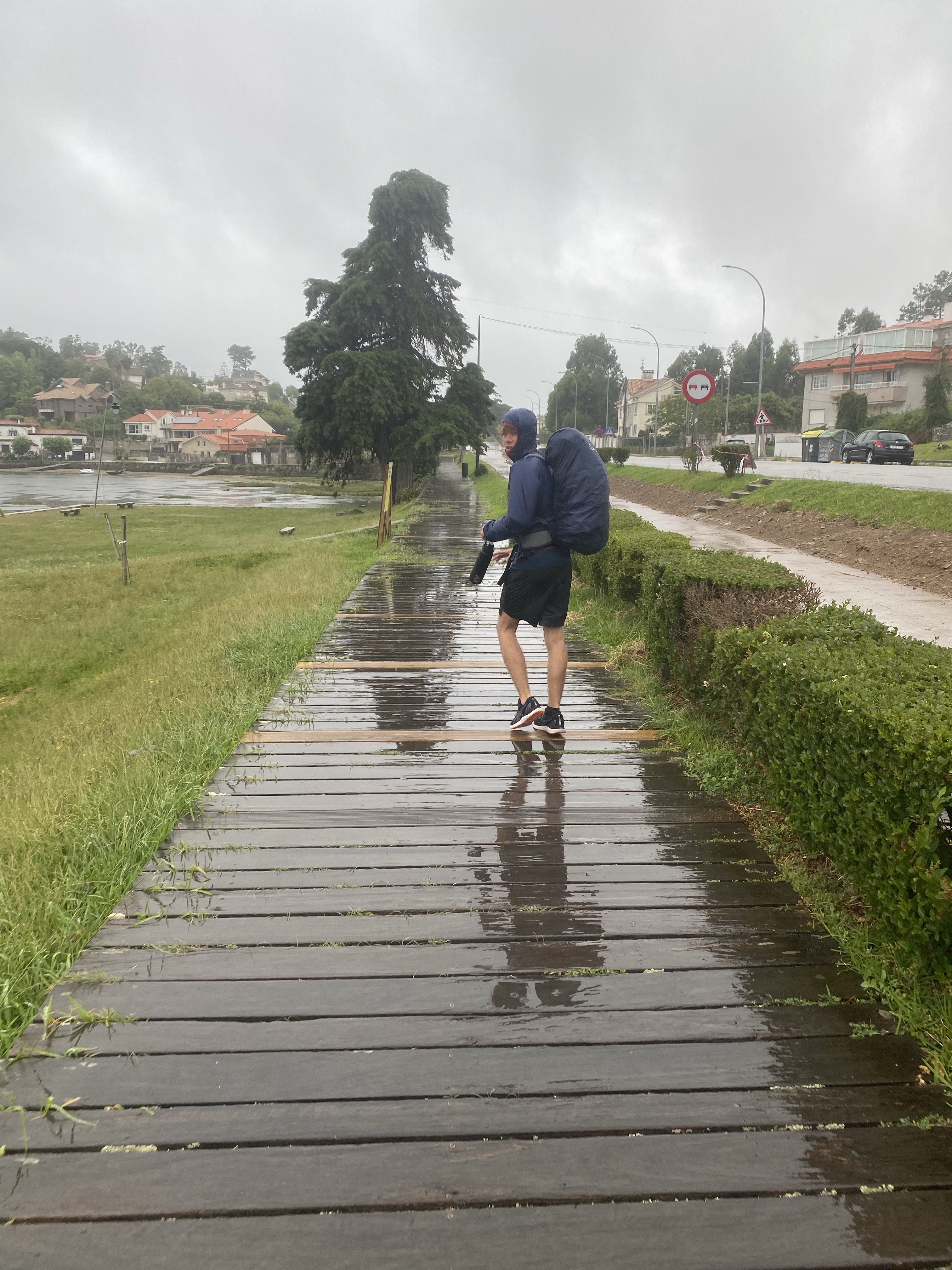 En toen was het donderdag. We hadden de weersberichten al voorbij zien komen en dat was niet best. Nu had ik berekend dat als we om 8.00 uur zouden vertrekken, we waarschijnlijker l tussen de buien door konden lopen. Ik hou het graag positief. De wekker werd een aantal keer op snooze gedrukt dus het werd een uurtje later. We waren nog geen 5 minuten onderweg toen het al begon te regenen. Rugzakken weer af, regen spullen uit de tas. Hoes over de rugzak, Pepijn z’n licht gewicht regenjas aan, bleek later dat dat licht ook staat voor lichte regenval… ofwel binnen de kortste keren was ook zijn shirt best nat bij de rits. Ik mijn poncho aan. Ik heb dat ding gekocht omdat de meeste pelgrims die gebruiken. Lekker handig want je hoeft je rugzak niet af te doen en gooit dat ding zo over de hele boel heen. Pepijn kwam niet meer bij en ik voelde me ineens zonder mede pelgrims een jaar of 85 … waarom had ik niet gewoon mijn leuke zwarte getailleerde regenjas mee?