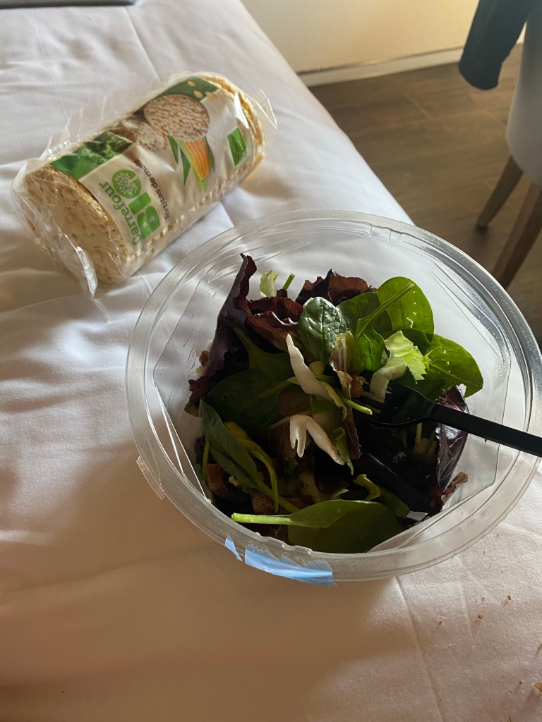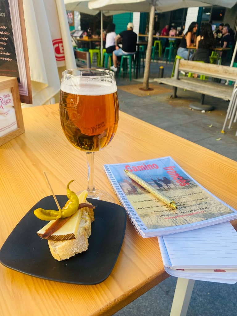 Daarmee in gedachten liep ik na een lekkere douche de deur uit om het stadje in te gaan. Maar dat verdrietige gevoel bleef. Oké..eerlijk!!! Ik had geen zin om ergens te eten tussen al die gezellige mensen die met elkaar aan tafel zaten te lachen . Dus supermarkt in om een salade te scoren. Waar ik zelfs met tranen bij de komkommers stond, Pepino in het Spaans, één van de koosnamen voor Pepijn. Dit klinkt als drama toch😃 Heb nog wel op een terras een biertje gedronken om de Camino in te luiden, sommige dingen moeten nu eenmaal 😇. Daarna met gierende slippers naar het hotel! En slapen want dit rot gevoel zou zo maar eens een reactie van een nachtje weinig slaap en best veel reizen kunnen zijn.