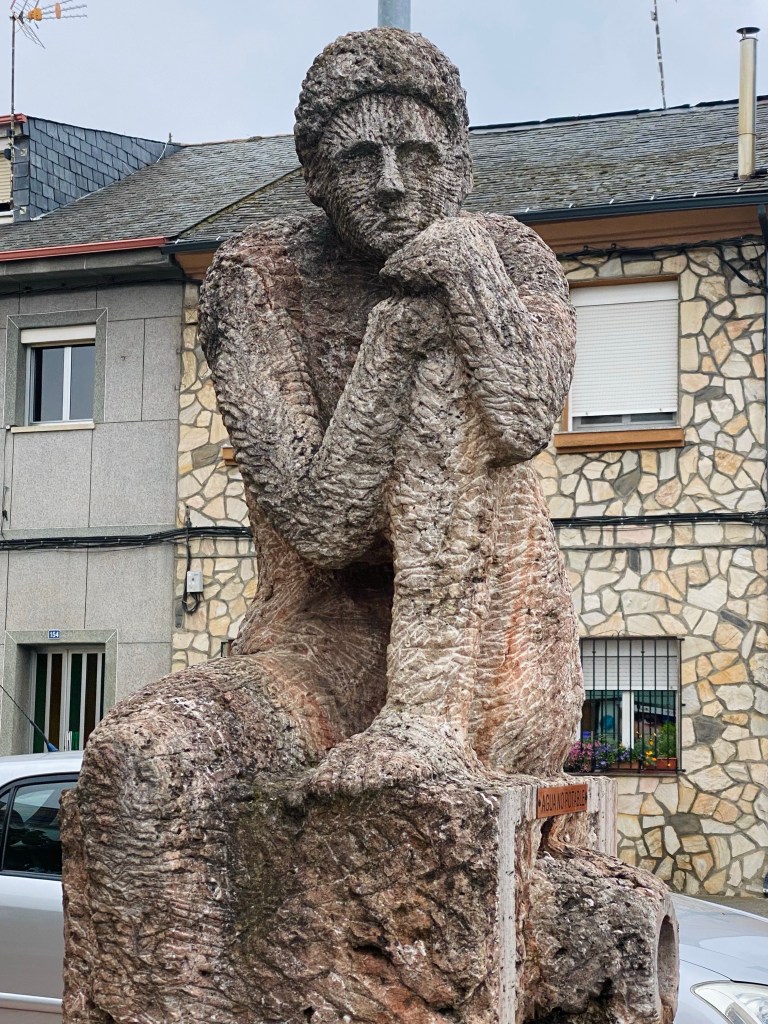 Het was mooi en stil onderweg.Ik zag een oud vrouwtje met een zware kruiwagen de berg op lopen ( of eigenlijk, niet oneerbiedig, waggelen). Ik liet mijn spierballen zien en wees naar haar. Ze dook in elkaar van angst… neeee natuurlijk niet, ze snapte wat ik bedoelde en begon in haar snelste Spaans te ratelen. Mijn No haplo Espanol maakte geen indruk. Tussen de regels begreep ik dat ze het over tomaten had en ze haalde met een zwaai een enorme mokerhamer te voorschijn.’Ehhh hou je dat dingetje goed vast lieverd en niet te veel zwaaien por favor!! Ik kon ook nog ontcijferen dat ze 93 was. Pittig vrouwtje, dat Spaanse temperament kan leuk zijn ( behalve bij 1 van mijn roomies gisterenavond) We lachten nog eens naar elkaar, zeiden adios en voor mij nog een extra Buen Camino. De weg ging verder…Het laatste stukje liep ik met een Amerikaan. Hij vroeg me of ik uit Engeland kom. What do you zeeee? Haha, die had ik nog nooit gehoord. Het is toch wel duidelijk aan mijn accent te horen dat ik niet met black tea with milk and cookies opgegroeid ben. Hij nam zijn woorden ook al snel terug. What ik than toch wel a bit jammer vond.