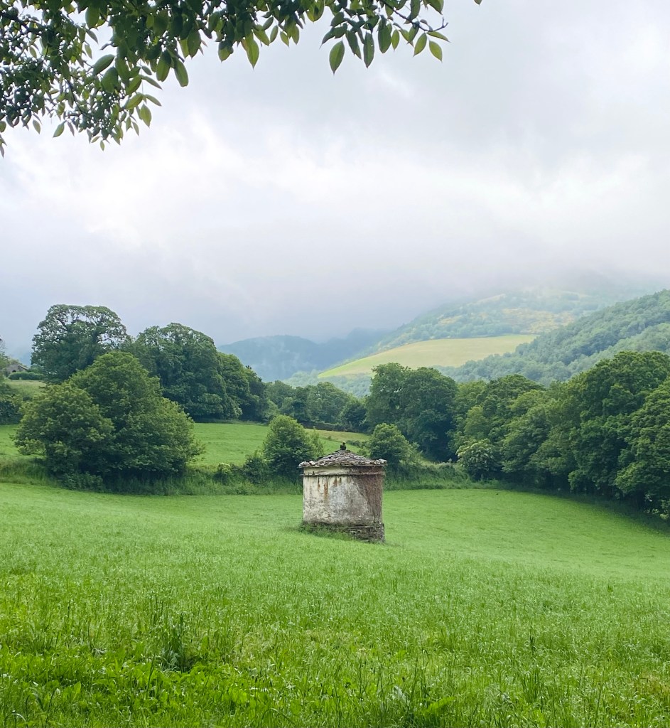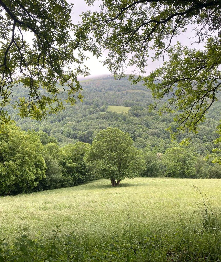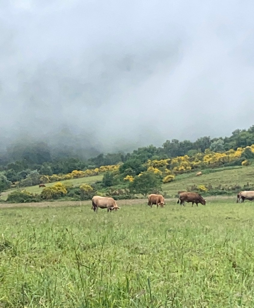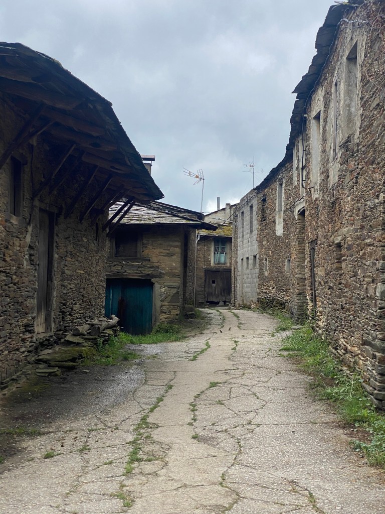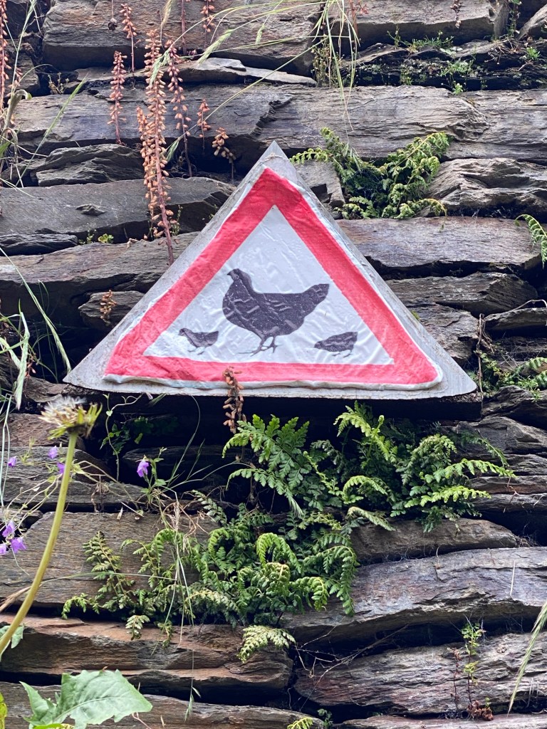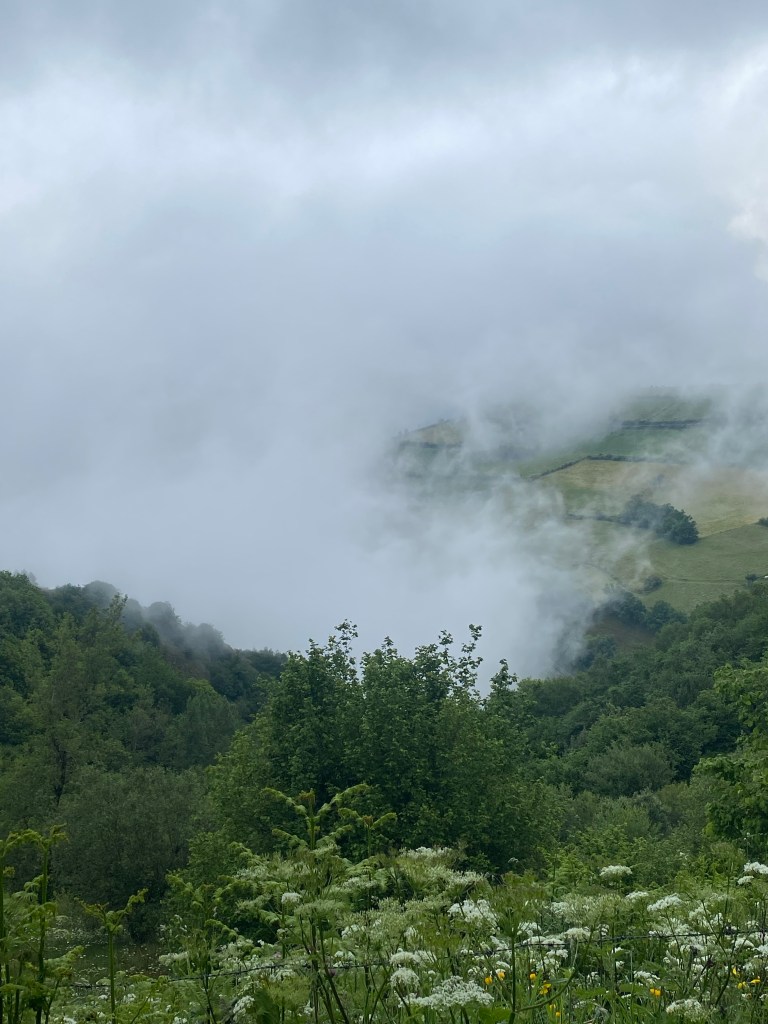 Buiten dat het bewolkt was bleek het wel een hele mooie route. Ik voelde me net Heidi. Alleen in de bergen met het geklingel van de koeienbellen om me heen. Het pad bracht me in hele kleine dorpjes van hooguit een paar huizen. Het leek alsof ik 80 jaar in de tijd terug gegaan was. Vervallen huizen met inpandige stallen voor een koe of varken, verweerde was aan de lijnen en hier en daar een oud mannetje met een kruiwagen met mest. Daar rook het hele dorp ook naar . Koeienvlaaien vermijden was onmogelijk. Maar tussen al die smurrie door zag ik ineens ook een man in zijn zondagse kleren staan. Ik vond het wel wat schattigs hebben midden in zo’n dorp waar je geen bingo middag hoefde te verwachten. Parapluutje aan zijn arm, sigaretje in zijn andere hand. Ik lachte vriendelijk naar hem en zei gedag. Maar ieuwwww…óf deze meneer had hele droge lippen óf… hij nam me op een iets minder schattige manier van top tot teen op en ging een paar keer met zijn tong langs zijn lippen terwijl hij iets zei waarvan ik de vertaling maar niet gezellig samen opgezocht heb. Misschien was het lang geleden dat hij iets anders dan zijn koeienstal gezien had maar ik zag het in ieder geval niet als een oppepper voor mijn ego…