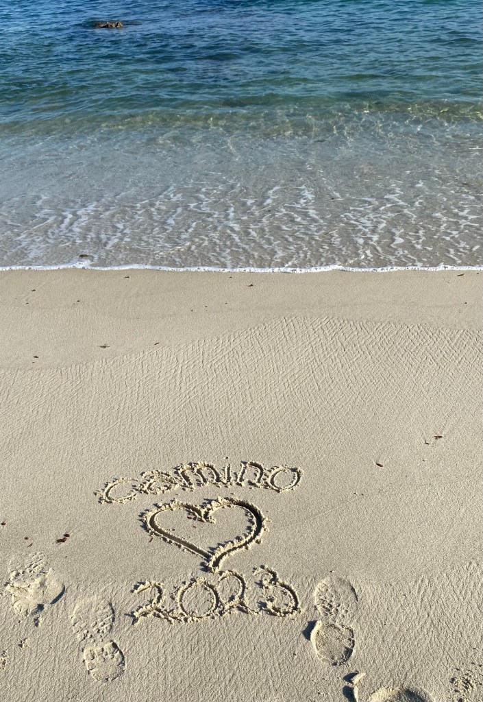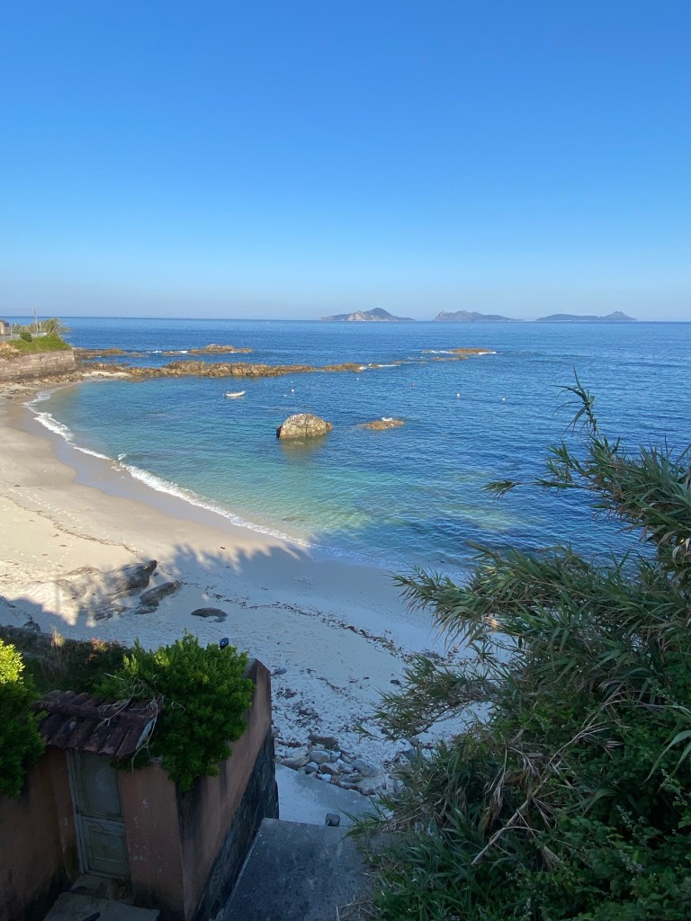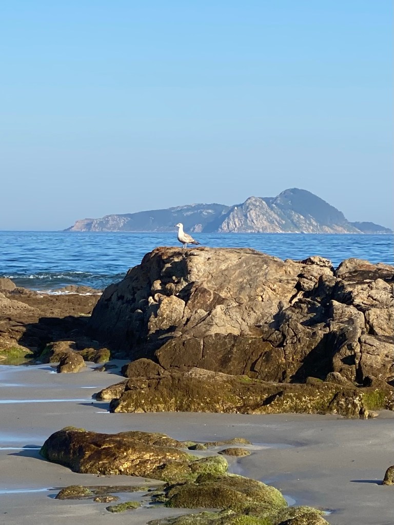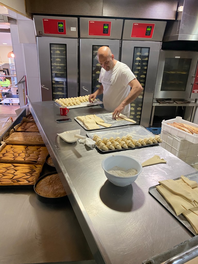 De route bracht me naar een geweldig strand vol grote rotsen. Hier had ik eerder met Pepijn gelopen in de regen, toen was het al mooi maar nu met de ochtendzon was het echt genieten. Wat stijle klimmetjes er achteraan en de geur van de heerlijke croissants volgen wat ik in de verte rook. Daar lag vast mijn ontbijtje te wachten. in het leuke kleine bakkerij/koffietentje vond ik een plekje toevallig naast 2 Nederlanders. Die was ik nog niet tegengekomen dus we hebben even gezellig zitten praten. Niet te lang want anders zou ik vandaag niet op het punt komen waar ik wilde. Al was het niet een hele lange route en bijna helemaal vlak dus ik kon wel wat tijd ‘verliezen’. Toen ik vroeg waar het toilet was werd ik door de bakker meegenomen naar de bakkerij. Ik twijfelde even of ik wel duidelijk ‘Dónde está el baño’ had gezegd. Ik Google translate altijd maar wat en die neemt het niet zo nauw. Geïnteresseerd maakte ik wat foto’s van de bakker terwijl hij bezig was en lachte enthousiast met een dikke duim omhoog. Toen schoof hij de tafel opzij en toverde de deur naar het toilet te voorschijn. Ik denk dat ze hem zelf ook al een tijdje vergeten waren😓Hopperdepop, snel plassen en door. Broek omhoog en op dat moment hoor ik allerlei dingetjes op de grond stuiteren. Mijn armband met edelsteentjes trok ik kapot. Getver… ik heb er een paar opgeraapt van die vieze vloer, de rest als een kadootje achter gelaten. Is tenslotte een Camino traditie om je steentje op een voor jou belangrijke plek los te laten😇