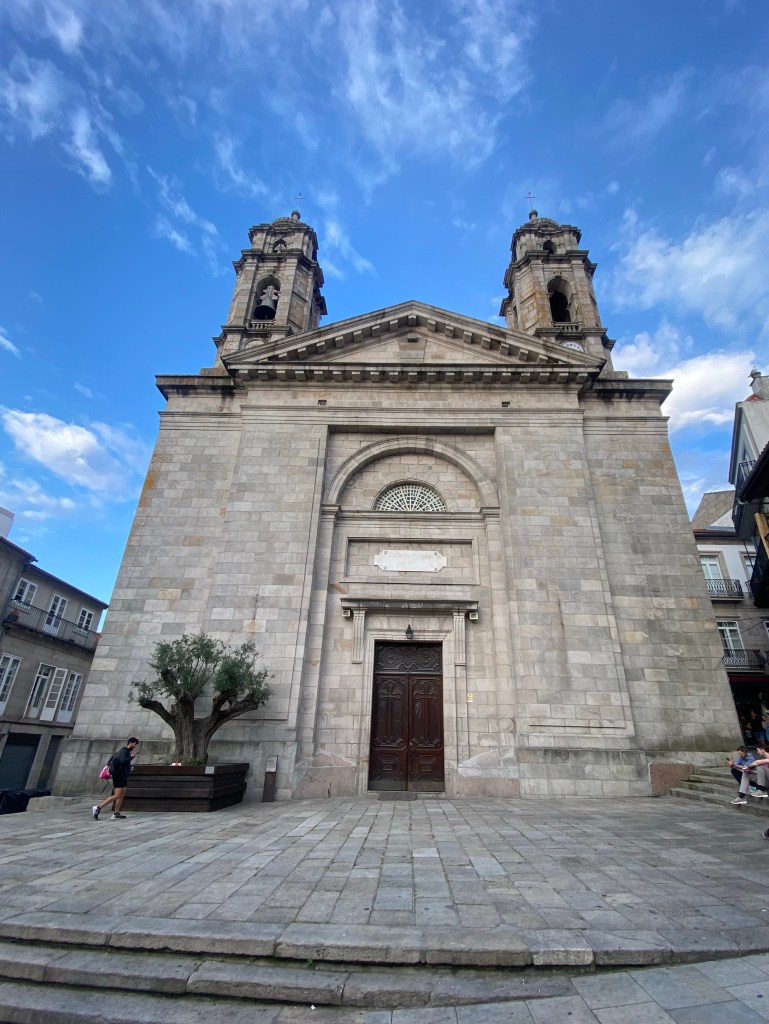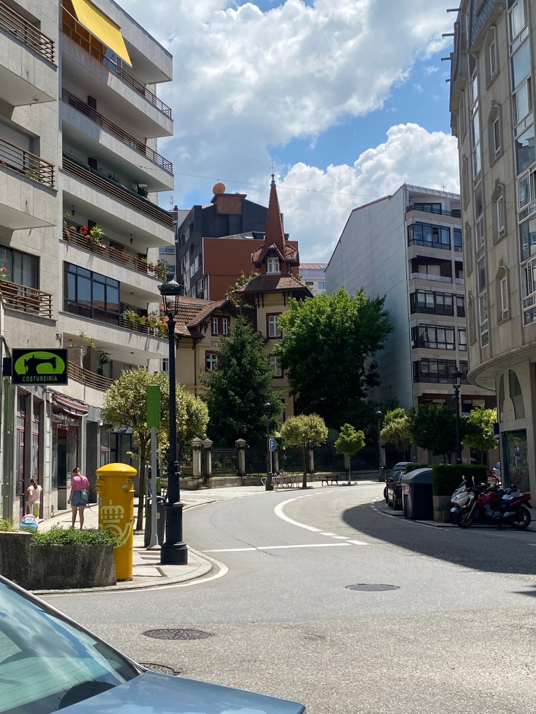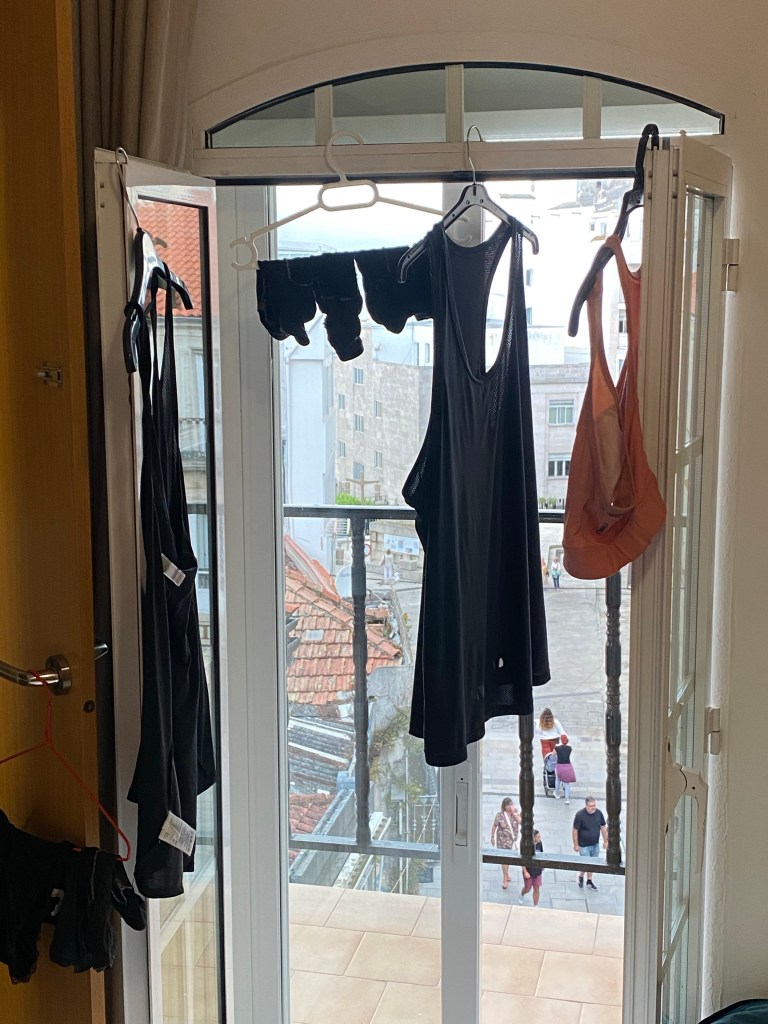 En daar liep ik na al die km-ers het drukke Vigo in. Zo’n stad waarvan je denkt dat je er bent en dan gewoon nog 3 kwartier aan het lopen bent. Ik had toen ik op het water stond te wachten wel mijn overnachting vast geboekt. Ik had geen zin om iets te zoeken en ik wilde een kamer alleen. Google Maps stuurde me naar rechts. Wtf… 6 trappen op?!?! Neeee nee neeee maar ik kwam er niet onderuit. Gek, ligt dat hostel bij een monument? Zal er wel net achter zijn dan. Maar het is bij de haven en dat ligt toch echt aan de andere kant. Toch vertrouwde ik meer op Google Maps dan op mezelf. Maar steeds gaf hij weer aan dat ik een rondje moest lopen. Inmiddels had ik dat ding al 5x van alle kanten bekeken. Ik plofte op een bankje neer om eerst mijn bakje meloen maar eens te eten. Daar kreeg ik de ingeving om de straat ernaast op google maps in te typen want het adres van het Hostal leidde me toch steeds weer hierheen. Wat er toen naar boven plopte klopte beter bij wat ik steeds al in gedachten had. Nog 17 minuten lopen. Op mijn tandvlees kwam ik aan. Langs gezellige terrassen waar heerlijke frisse dames met haar in de krul, de lekkerste luchtjes op, leuke kleren aan, mooi zaten te wezen. Zei ik jaloers😆 want ik voelde me vies, armoedig, niet om aan te zien, bos pluis haar en stinkerig. Echt veel goeds voor je zelfbeeld doet zo’n dagje niet… behalve dat ik weet dat ik me wel red in het leven🙈