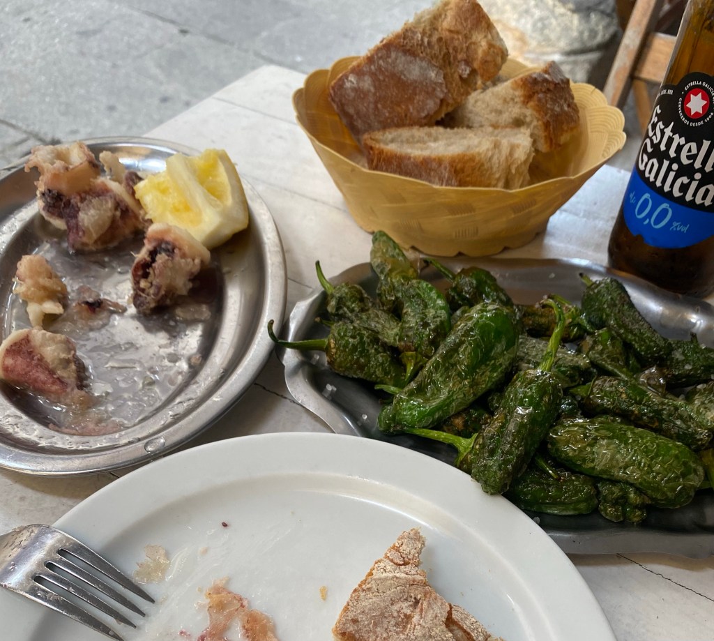 Ik had niks geboekt omdat ik daar wilde beslissen of ik door zou lopen of zou stoppen. Het werd het laatste. Ik had zin in taart, Padron pepers, inktvis, alcoholvrij biertje, koffie en het liefst allemaal tegelijk. Op booking had Ik al een hostel gezien maar was nu benieuwd of de prijs anders zou zijn als je gewoon binnenloopt. Mocht het vol zijn dan had ik genoeg tijd iets anders te zoeken en keuze genoeg hier. Maar er was plaatst en het scheelde inderdaad €5,-.