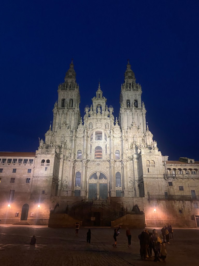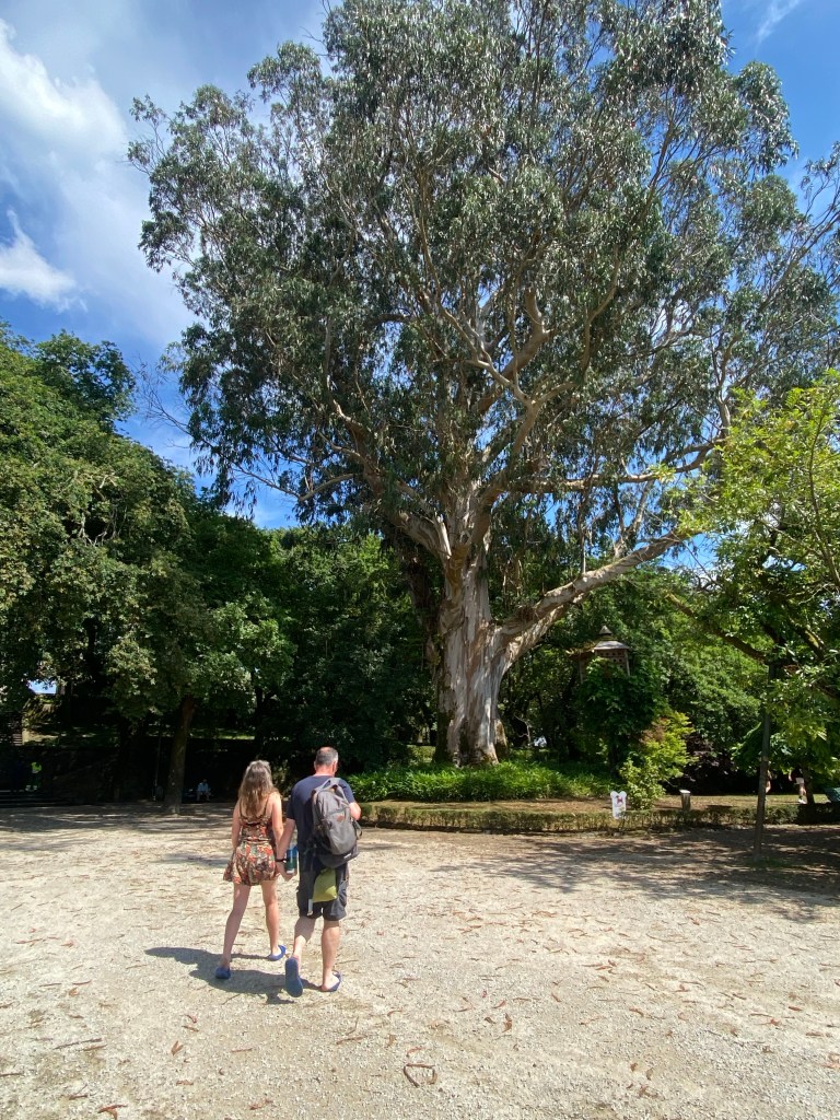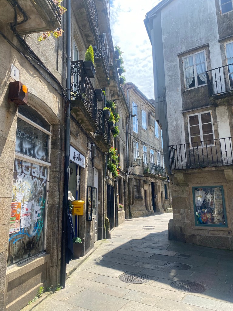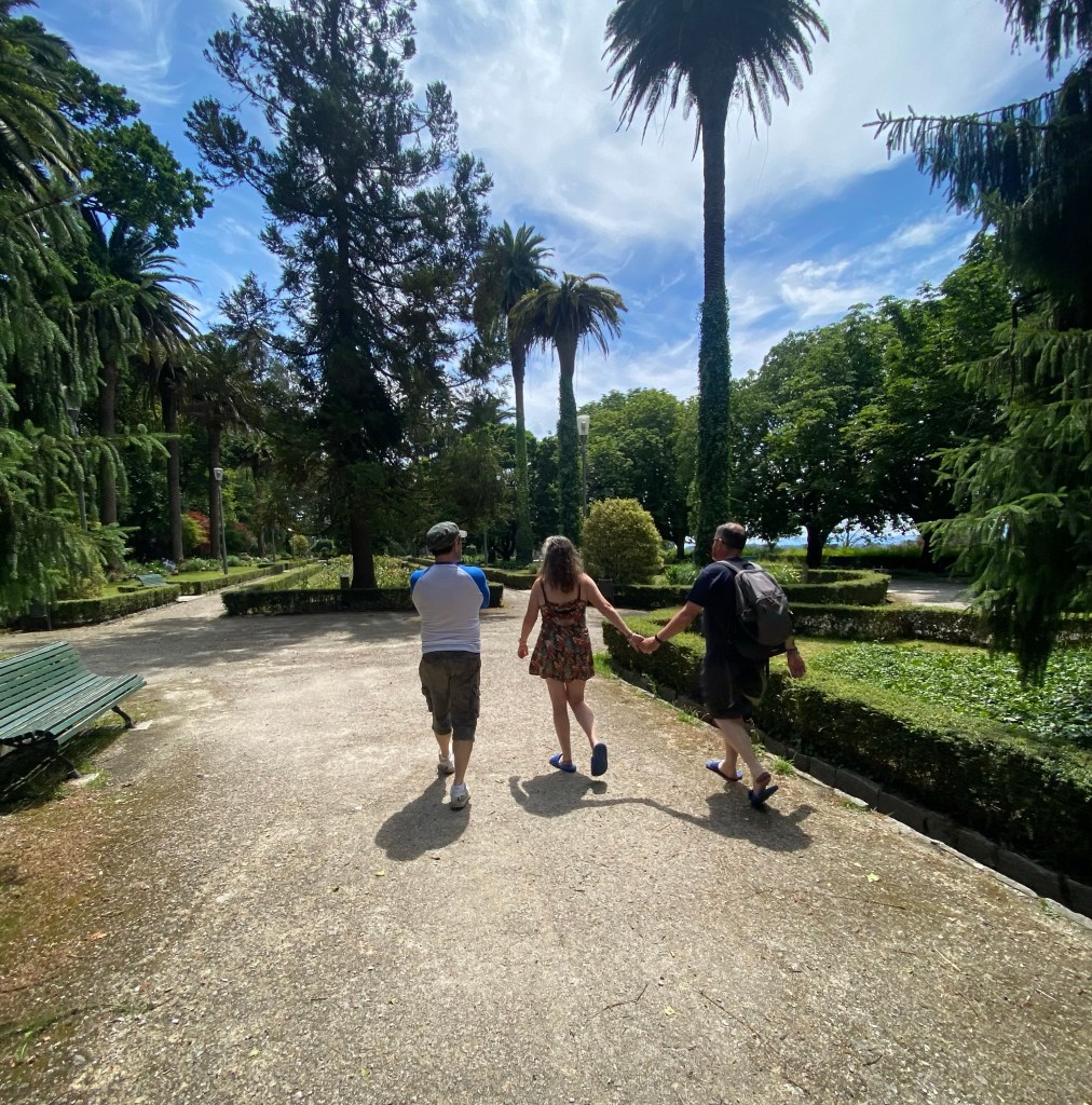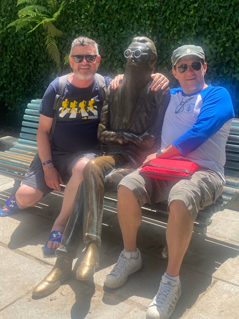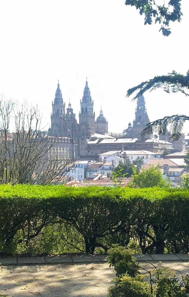 De eerste die aankwam was ik zelf, gevolgd door Graeme diezelfde middag. Zou ik hem nog herkennen. Lang leve social media🙃. We hadden in het park afgesproken. Een paar keer had ik twijfel, zou die man hem zijn. Nope, veel te oud, die dan, nee, veel te lang, die dan, nee veel te Spaans. Toen hij aankwam lopen was er geen twijfel. Buiten het gewone rijpingsproces (klinkt leuker dan ouder worden) niets veranderd. En het was meteen alsof de tijd had stil gestaan en er niet zo’n lange tijd tussen gezeten had. We hebben het mooie park van Santiago doorgewandeld die ik zelf ook pas de 2e Camino ontdekt had en voor hem ‘nieuw’ was. Terwijl we onophoudelijk bleven praten en heel veel lachen over van alles en nog wat. We hadden elkaar zoveel te vertellen. Het is heel bijzonder dat deze 2 mensen (Steve en Graeme ) die ik hooguit 4 dagen live ken van alweer 5 jaar terug zo vertrouwd aanvoelen. Dat zegt genoeg over de chemie van de Camino. Wanneer je langer dan een uur aan iemand blijft plakken dan zijn de gesprekken niet meer oppervlakkig maar vanuit het hart, de grappen echt grappig, de stiltes verbindend. Elkaar zien zonder poespas maar in doorgezwete t-shirts, verbrandde neus, haar op stand ontploft, schuim op de mond, snottebellen al over the place, nahhh die laatste twee dan net weer niet. Daarnaast met een zelfde doorzettingsvermogen , doel, focus en wil om het uiterste eruit te halen. Santiago bereiken, al moet het op je knieën. Dat schept een band! Nu hadden deze twee mannen ook nog eens heel veel leuke, interessante verhalen te vertellen, hebben veel humor en op hun manier spiritueel dus dat was erg gemakkelijk om achteraan te blijven hobbelen, of misschien was het wel andersom 🤪. Ze zitten voor altijd in mijn hart (zo ook mijn Camino maties van 2019).