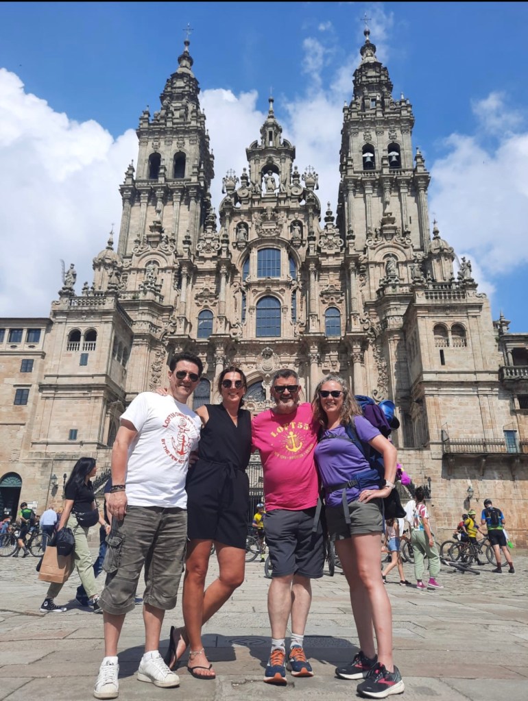 Daarna de reden waarom er van schrijven niets meer terecht is gekomen. Er stond me namelijk nog iets heel leuks te wachten. In 2018 heb ik een geweldige tijd gehad tijdens mijn eerste Camino met 2 mannen uit Engeland. Één van hen is Steve waar ik al eerder over geschreven heb, hij was dit jaar een dag of 5 na mij, samen met zijn vrouw Zoë, de Camino gestart en de ander is Graeme, de vriend van Steve die hem kwam verrassen (al wist hij dit inmiddels wel). Wat betekende dat alles samen viel en wij een spontane reünie in Santiago hadden. Nu is het extra bijzonder omdat ik 5 jaar geleden na de Camino op het strand liep en wist dat ik ze terug zou gaan zien als ik 50 was. Wat dus nu het geval is. Ik heb dit toen ook aan een vriendin verteld, lucky me anders geloofd geen hond dit natuurlijk. Dus toen ik de appjes kreeg bleef mijn mond een uurtje of 5 open staan van verbazing.