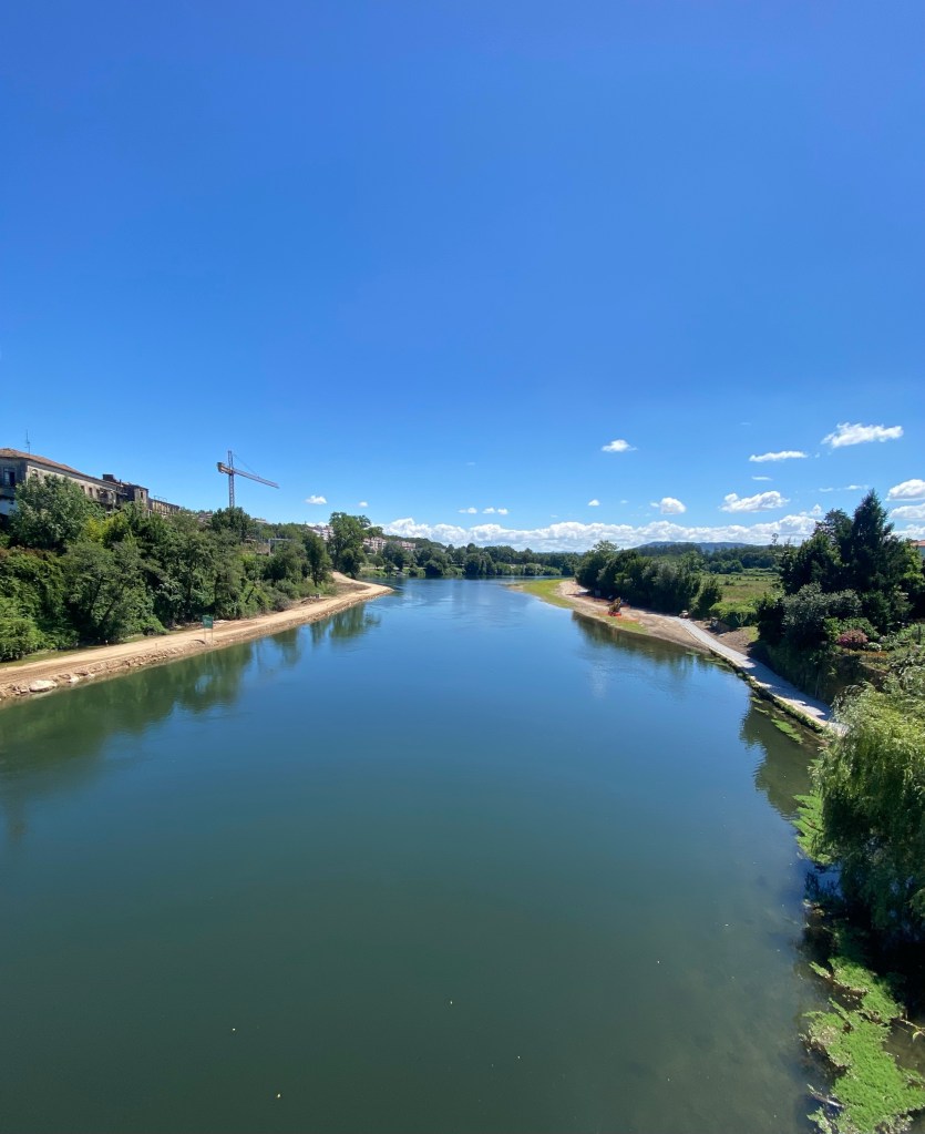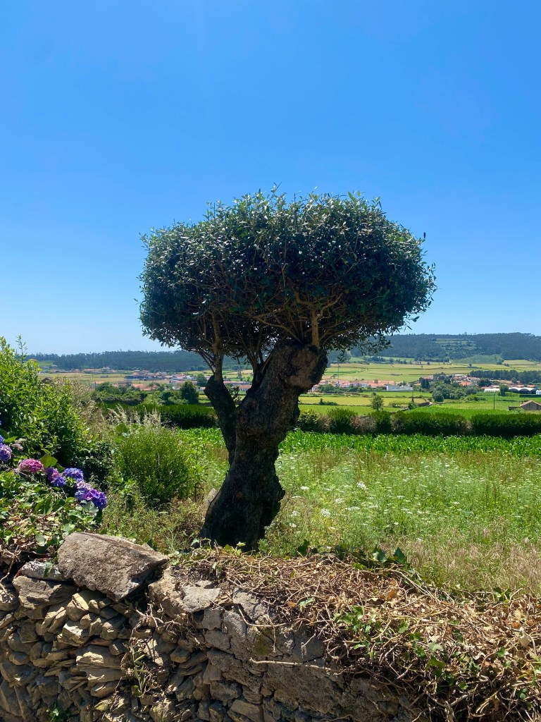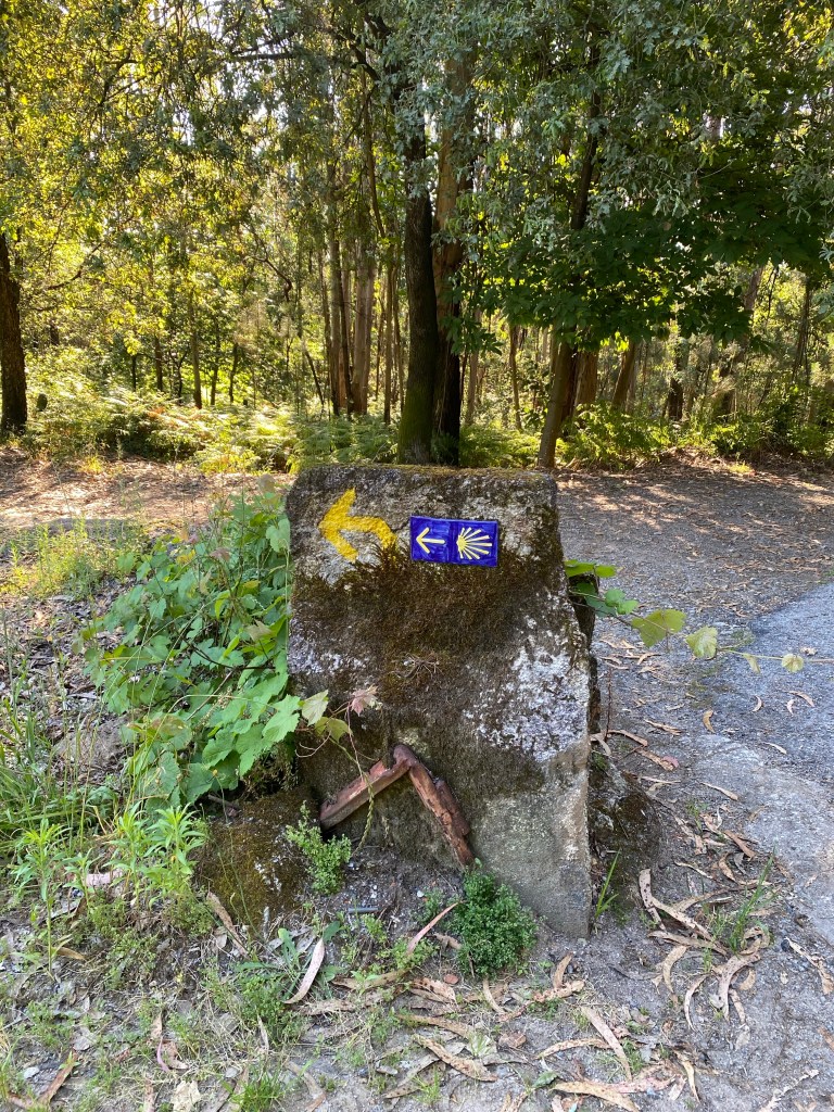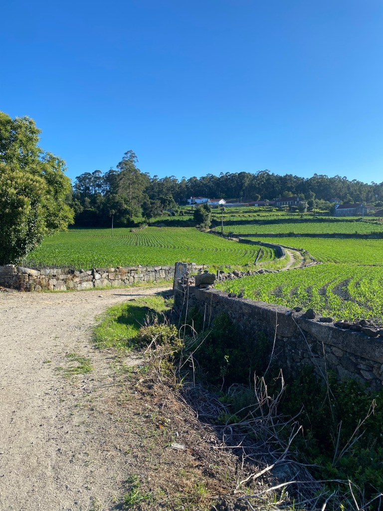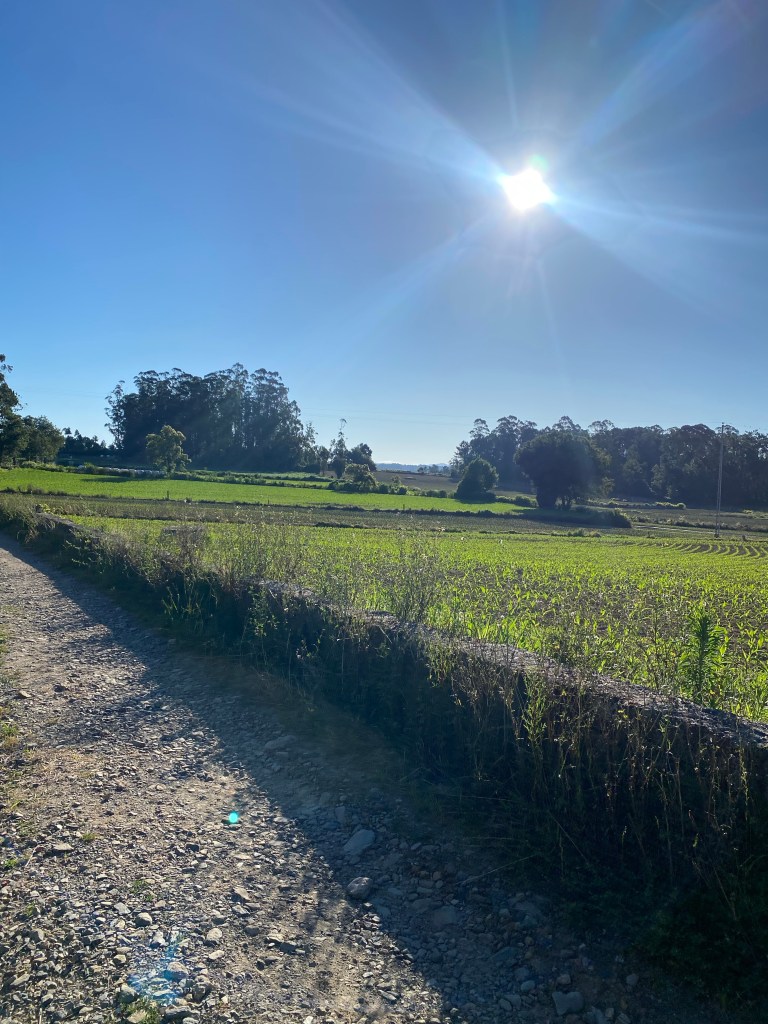 Kortom, gekkig nachtje en vroeg de deur maar uit! Om half 7 zat ik aan de overkant een lekker koffietje te drinken. De overige kamergenoten zaten er ook of waren al onderweg. Dat waren de laatste wandelaars die ik die dag heb gezien. Ik denk dat de kustroute het over genomen heeft van deze. Wat ik tot nu toe ook wel begrijp. Neemt niet weg dat het een hele mooie dag was. Een kort ommetje door een gemiste pijl. Dat terwijl mijn Caminovriend Pico me net daarvoor op de app nog gewaarschuwd had. Toen ik in een cafeetje aan de dame achter de bar vroeg welke kant ik op moest wees ze me het pad rechtdoor en dan naar rechts. Bleek dat die mevrouw dezelfde afwijking heeft als dat ik heb en het verschil tussen links en recht nog wel eens door elkaar haalt.