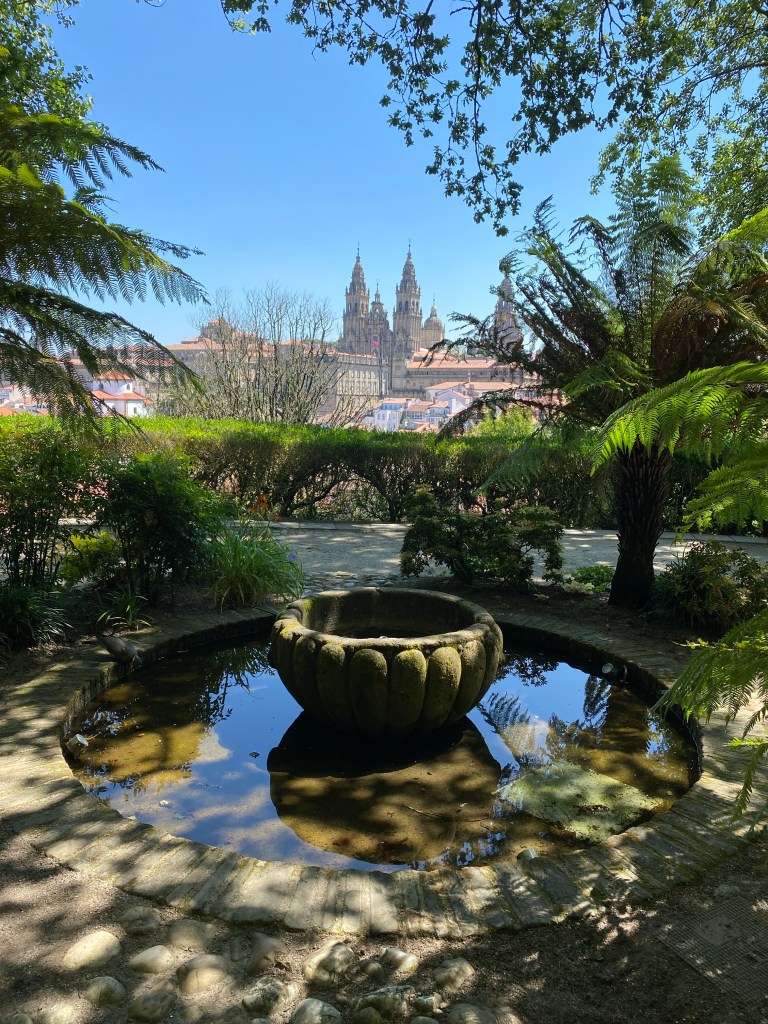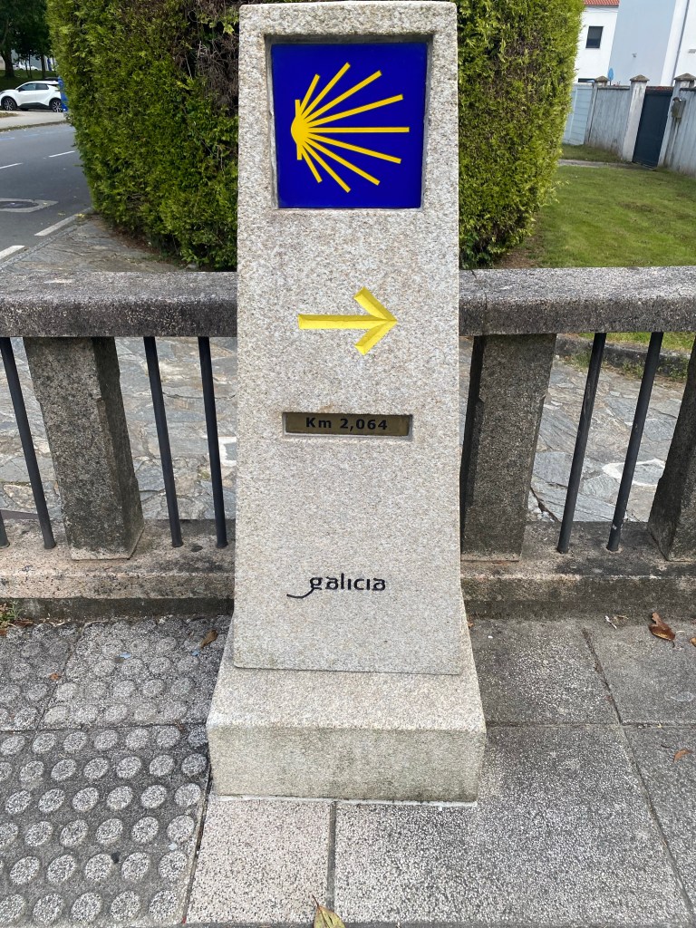 De laatste 8 km naar Santiago gingen van start. Ik besloot mijn telefoon weg te doen en iedere stap bewust in me op te nemen. Onderweg is er 1 koffietentje en die was gesloten wat betekende dat ik al rond 9.30 uur Santiago binnen zou lopen. Onderweg kwam ik de Duitse dames tegen, waarvan ik de afgelopen 2 weken gedacht had dat het een stel was, wat dus niet zo bleek te zijn. Het was emotioneel voor ze, dit laatste stukje, dus het leek me beter in mijn eigen tempootje door te gaan en hen deze reis samen af te laten ronden. Zelf leek ik wel steeds harder gaan lopen. Op de bekende paal waarop de kilometers aangegeven worden stond 2 km. Dit betekende alleen nog de lange straat, waar geen eind aan lijkt te komen, naar het oude centrum. Daar was het mooie park op links. Nu alleen nog de stoplichten en dan zou ik in één van de gezellige straatjes van Santiago zijn. Tijdens het wachten op groen kwam ik de Amerikaan tegen van een paar dagen terug. De eerste felicitaties over en weer waren binnen. Ik hou zo van de energie in deze stad. Al die pelgrims met rugzak of al fris gedoucht. De smalle drukke straatjes, Het voelt als thuiskomen.