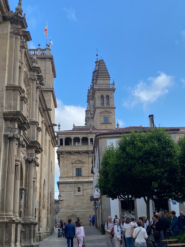 Zoals ieder jaar had ik het appartement geboekt dicht bij de kathedraal. Ik keek er naar uit want het voelt inmiddels als mijn eigen huisje in Santiago. Toen ik bij een kop koffie appte hoelaat ik mijn rugzak neer kon zetten kreeg ik de reactie ‘ ik heb je geen formulier meer gestuurd en ik zit vol.’ Huh? Wattttt? Ik vroeg haar of ze serieus was al wist ik het antwoord wel. Al jaren regelen we het via de app. Sterker nog, ze had dit zelf zo voorgesteld en ik had ook dit keer weer de bevestiging gekregen dat het vrij was deze 2 nachten, waarop ik gereageerd had dat ik graag kom! Uiteraard stuurde ik haar onze appberichten door. Er kwam nog een kort antwoord dat het allemaal te druk was voor haar alleen en daarna bleef het stil. Oké, geen slaapplaats dus. Ik was lichtelijk geïrriteerd maar eerder verbaasd over deze manier van doen. Loslaten en door! Ik ging snel op zoek naar iets anders. Aangezien het altijd druk is in Santiago was ik een beetje bang dat het een heel ander verhaal zou gaan worden. Het is voor mij altijd een groot kado om na 2 weken slaapzalen een heerlijke hotelkamer te hebben met een schone douche, zonder haren, een wasbak zonder tandpasta en een matras wat niet kraakt. Daarnaast wil ik heel graag midden in het ‘feestgedruis’ zitten en niet een kwartier lopen er vandaan. Dit kon nog wel eens een uitdaging gaan worden. Zolang het maar geen slaapzaal werd was alles wel oké. Maar het geluk was meer dan met mij!!! Ik vond iets wat me wel wat leek en besloot er heen te lopen. Het was alleen maar een trappetje naar beneden verwijderd van de kathadraal en YES, er was plek! Na wat onderhandelen over de prijs (geloof me, dat komt echt doordat de reis in het teken staat van het goede doel) kreeg ik de kamer te zien. Oehhhh dit was gewoon nog veel beter dan waar ik normaal zit. Ik was blij, neeee ik was super blij!!!! En de mevrouw van de receptie daardoor ook want ze liep met een grote lach terug naar haar kantoortje en maakte de prijs in orde die ik haar voorgesteld had.