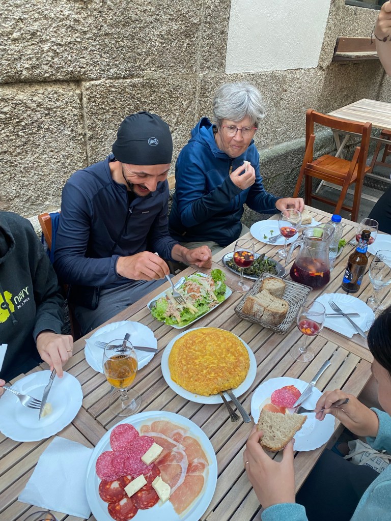 Daar zaten we, verschillende nationaliteiten bij elkaar, Duits, Italiaans, Marokkaans, Frans, Engels met Zuid Afrikaanse roots en deze Hollander. We hadden een geweldige avond, kannen met Sangria en lekkere hapjes, veel gezelligheid, leuke gesprekken en wat gebarentaal hier en daar voor de iets minder goed Engelssprekende aan tafel. De hele Camino familie was compleet. Wat een rijkdom!