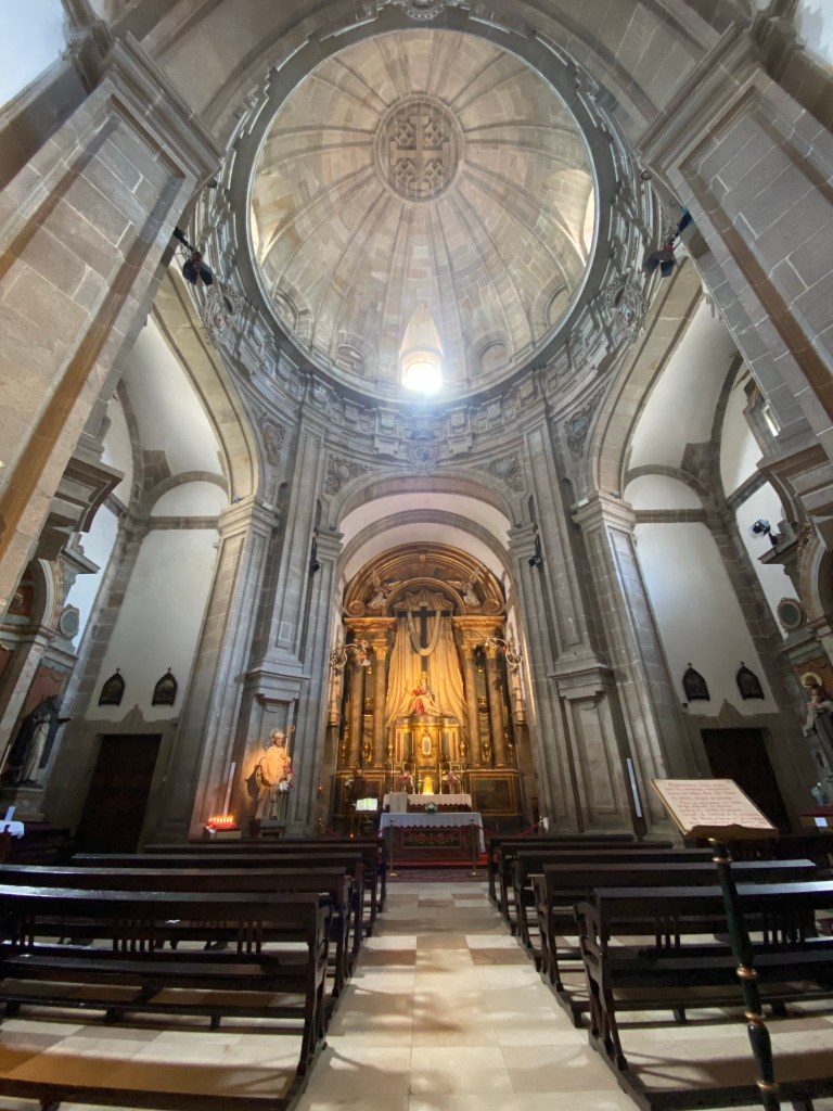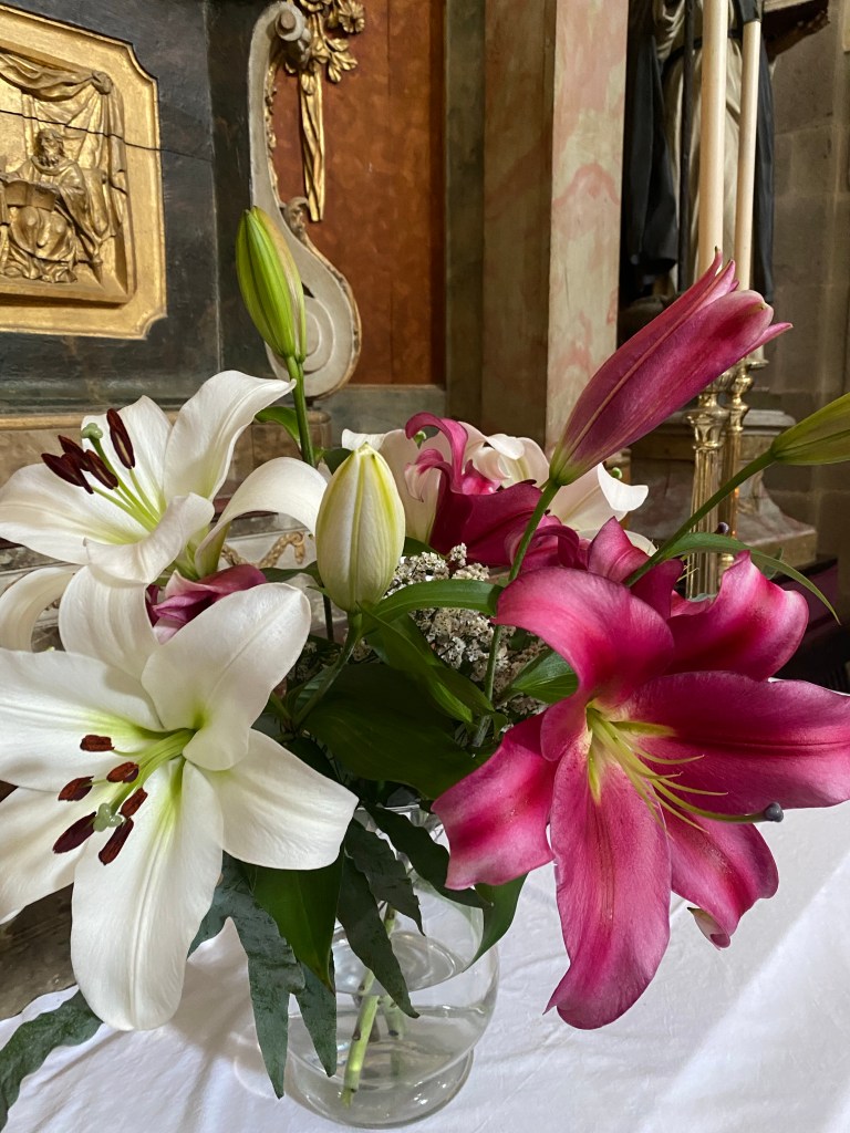 Daarna door het volgende ritueel. In een kerkje wat achteraf, waar bijna nooit iemand is, brand ik de kaarsjes voor degene die me dit gevraagd hebben, maar ook voor alle Caminovrienden van de afgelopen jaren, voor mijn lieve kind, mijn vader, voor liefde en vrede in de wereld, voor iedereen die me gevolgd heeft en wel wat licht kan gebruiken, voor een ziek familielid, en zo meer. In totaal waren het 12 lichtjes die stonden te stralen. Zoals eerder al gezegd ben ik niet katholiek maar ik voel altijd zoveel rust om in een kerk te zijn. Er stond muziek aan, de geur van lelies die overal in vazen stonden en het mooie licht wat door de koepel naar binnen viel. Ik denk dat ik hier wel meer dan een uur gezeten heb.