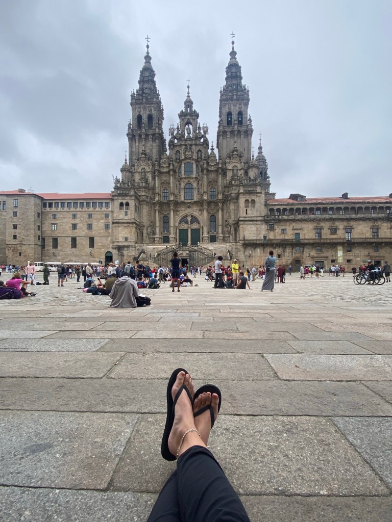 En daar was die dan, de kathadraal en het grote plein vol blije, emotionele mensen die net als ik een bijzondere reis gemaakt hadden. Ik stond er alleen en liet mijn tranen heerlijk stromen (yep, er was nog wat over). Van alles ging er door me heen maar dankbaarheid was wel wat de boventoon voerde. Dankbaar dat mijn lichaam me weer heeft gedragen ondanks dat ik me daar vooraf best wat zorgen om had gemaakt, dat zovelen mijn actie gesteund hebben, dat ik geweldige mensen heb mogen ontmoeten, dat ik deze tijd voor mezelf heb gehad, dat ik zo sterk heb mogen voelen dat de basis van alles liefde is en we allemaal hetzelfde doel nastreven, de wereld een beetje mooier en liever maken.